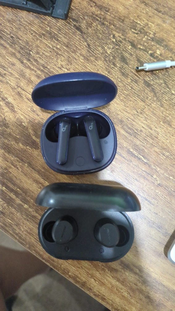 Two pairs of wireless earbuds and their charging cases. One pair is dark purple, the other black.