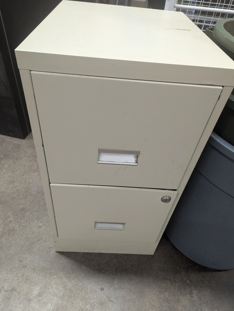 Two-drawer metal filing cabinet. Cabinet has a key lock.