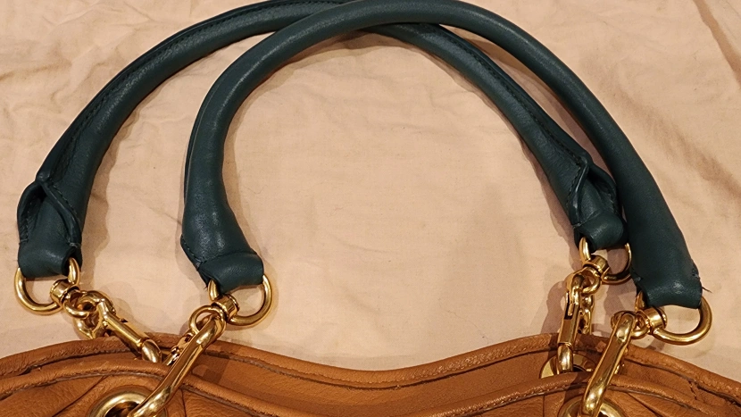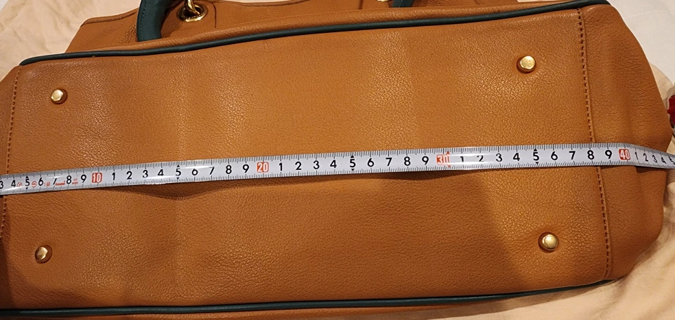 Brand new brown leather tote bag with green leather handles and gold hardware.