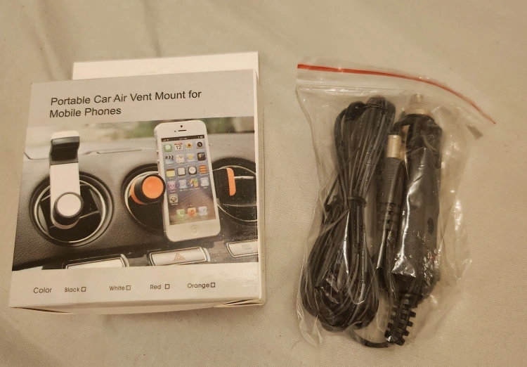 Portable car air vent mount for mobile phones. Includes a car charger.