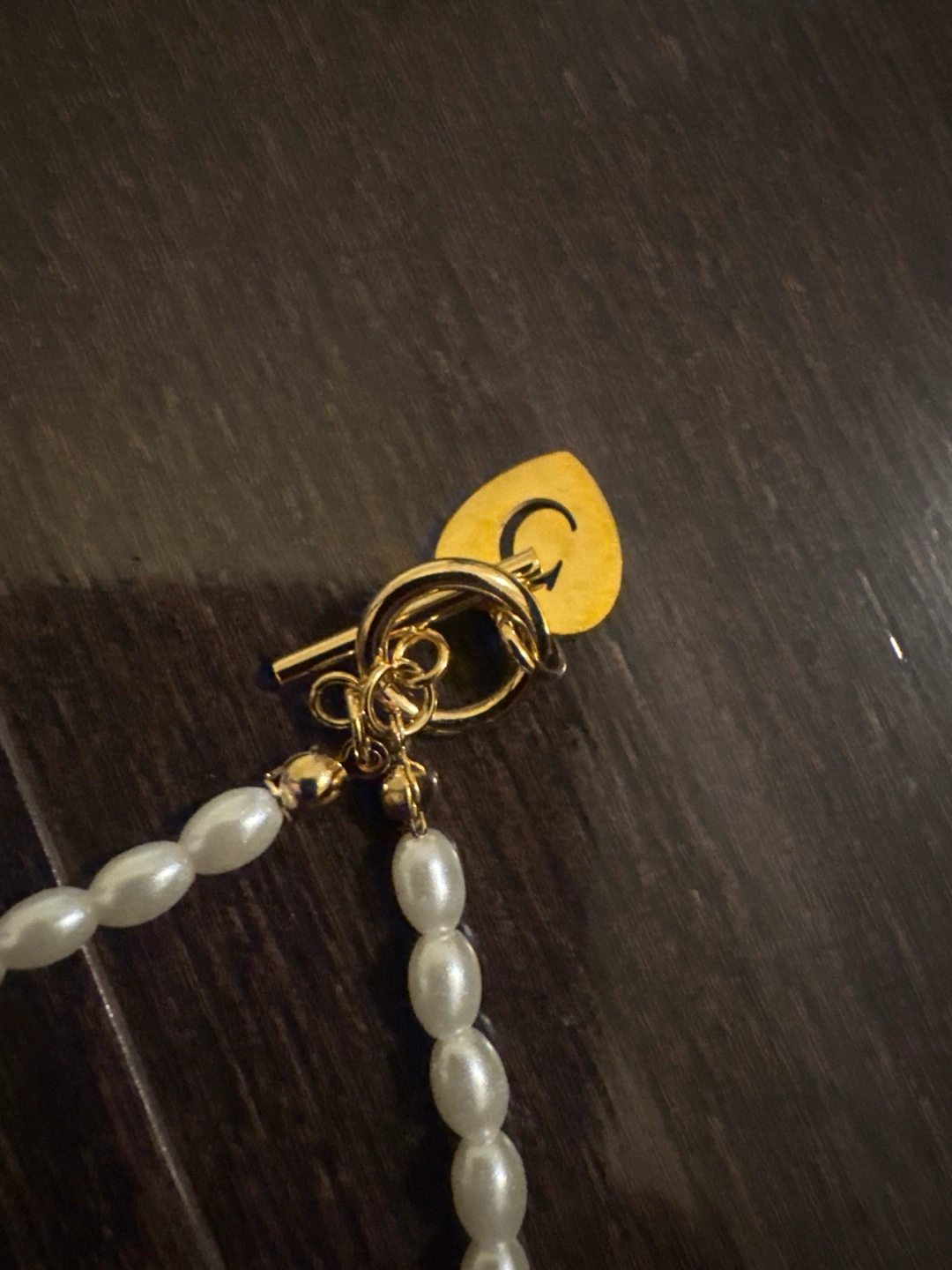 Pearl necklace with a gold heart charm, letter 'C' on the charm. Comes in a box.