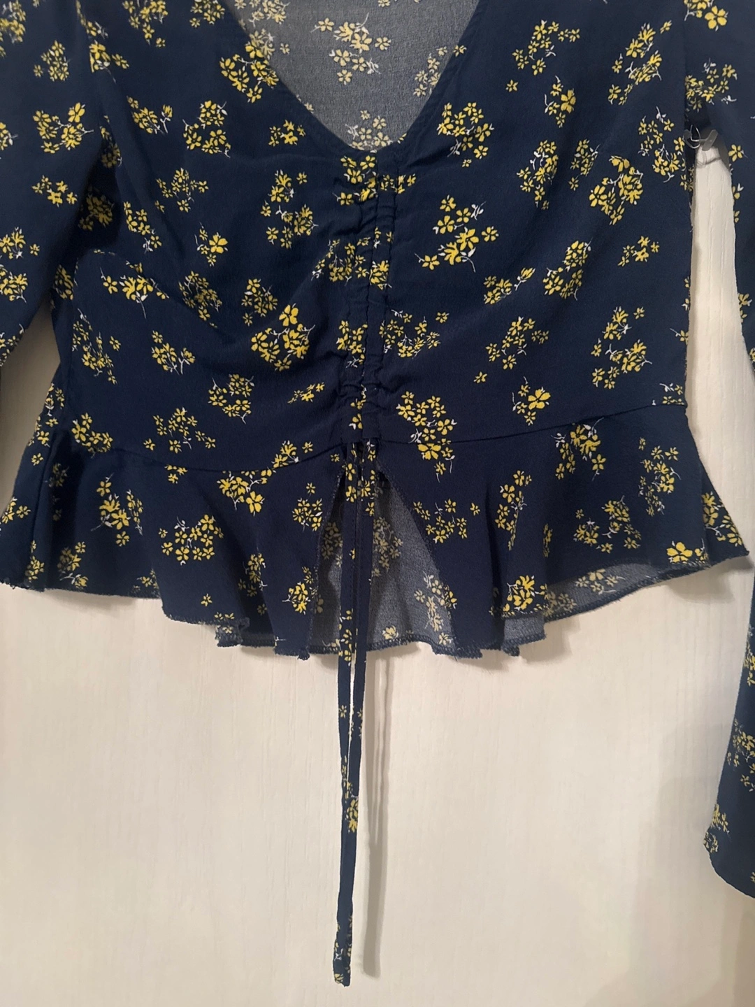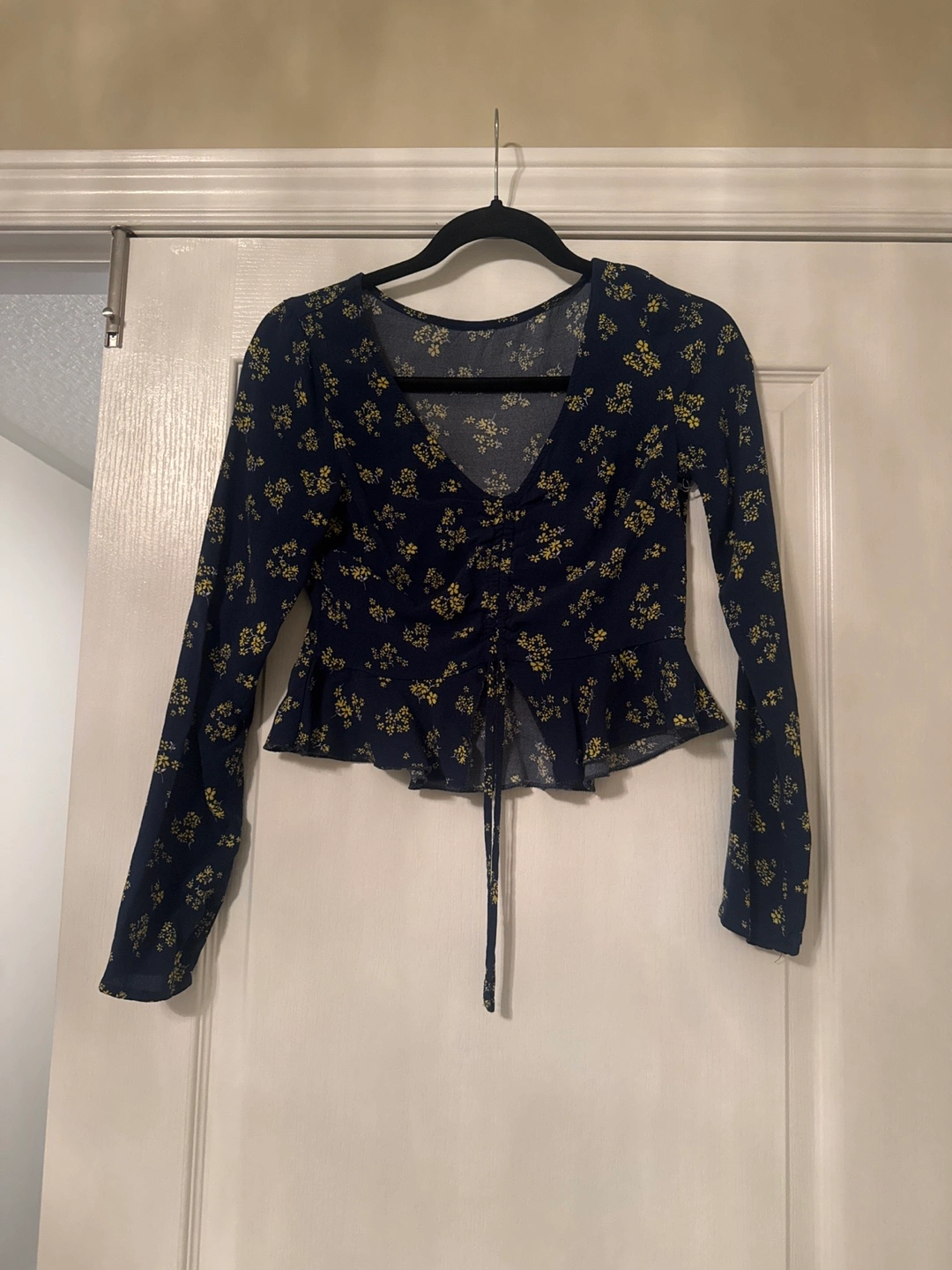 Navy blue and yellow floral crop top. Long sleeves with a cinched waist and a ruffle hem.