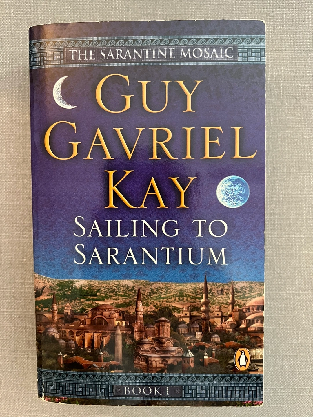 Paperback book, first volume of the Sarantine Mosaic series. Book in good condition, cover has some minor wear. Published by Penguin Books Canada.