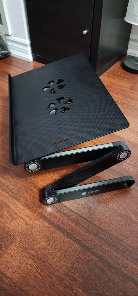 Black laptop stand with cooling fan. Adjustable to multiple angles. Folds for easy storage. I don't have the power cord for it anymore and the fans were a little noisy anyways but it's great for all sorts of sitting positions.