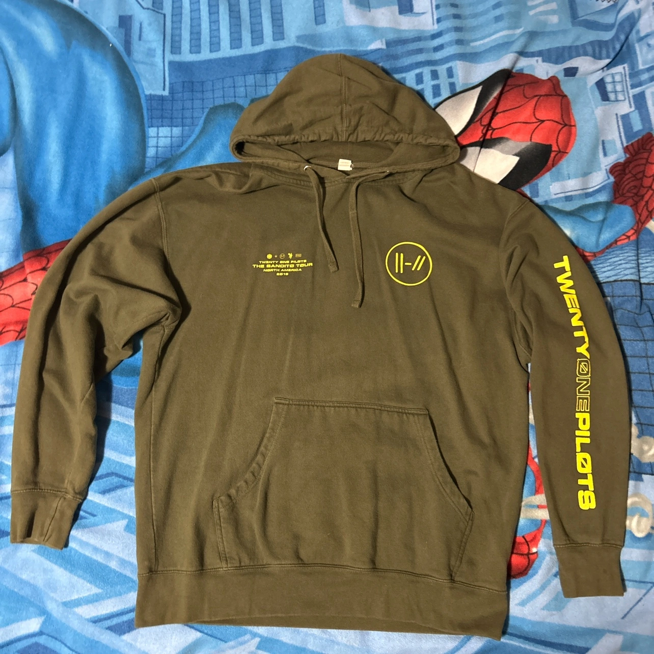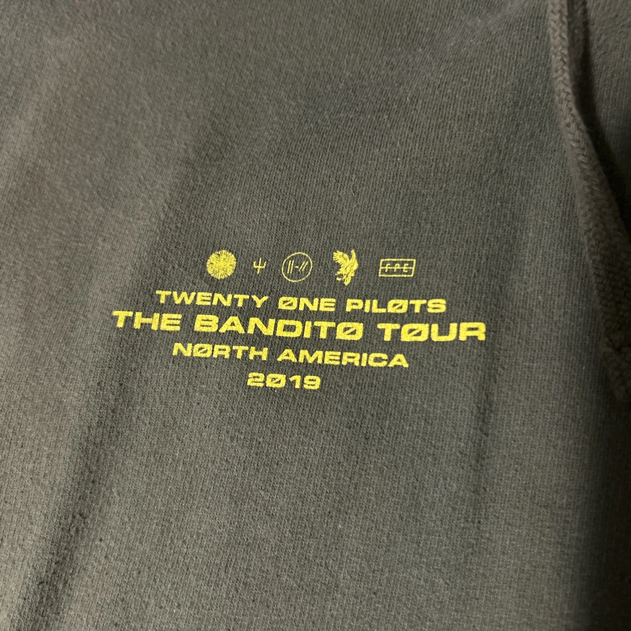 Official band tour hoodie mech from their 2019 tour. It’s overall in good shape with some minimal wear to it. The graphics are near perfect shape with no damage.
