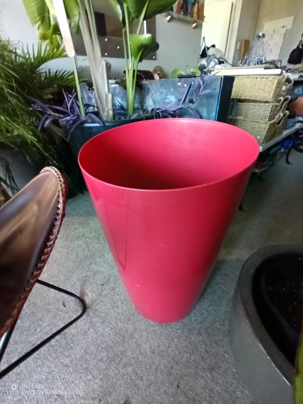 Large red plastic pot with self water compartment inside. Good condition. Has a beautiful curve at the top. 16x24