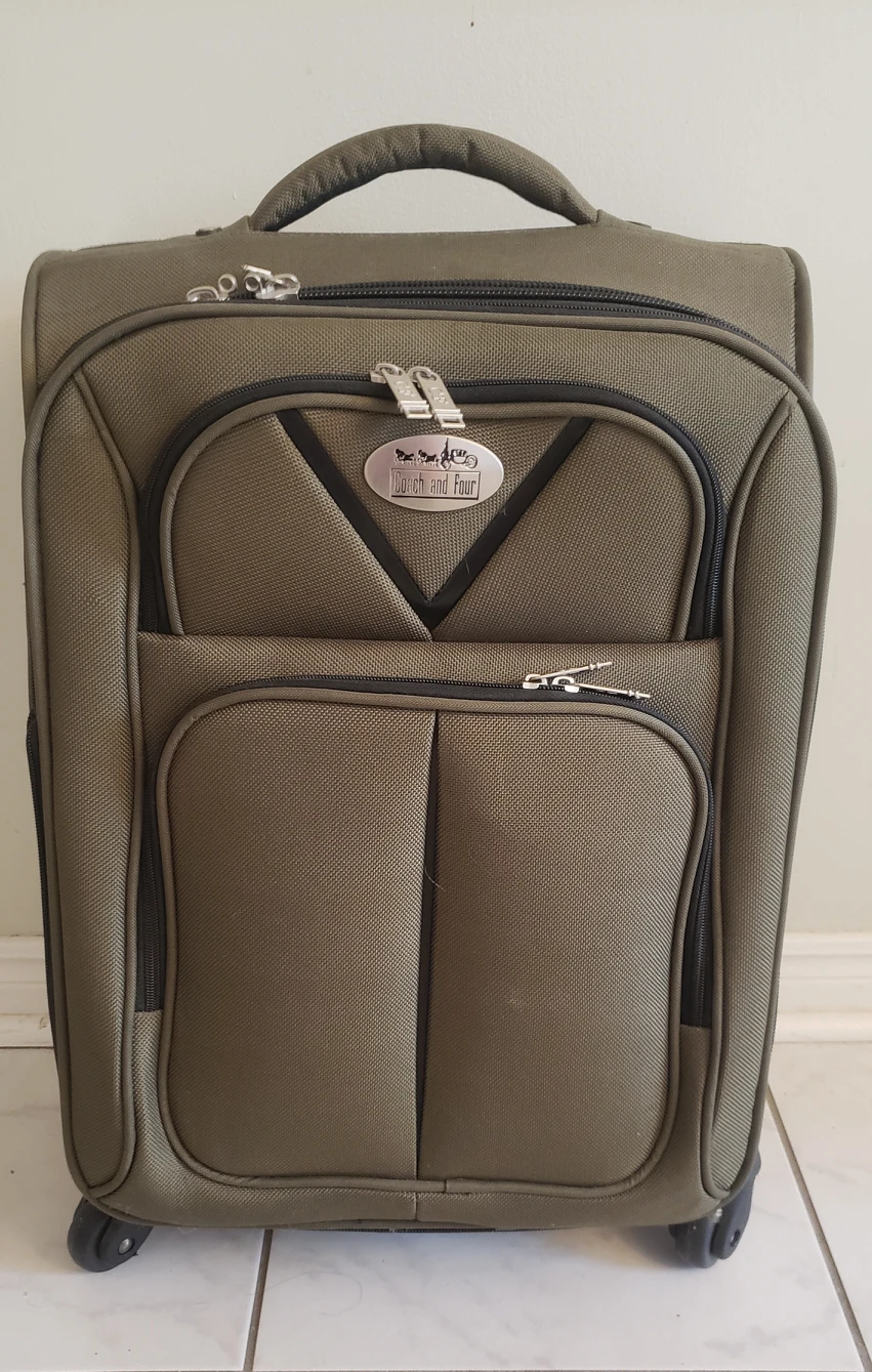 Navy hunter green four wheel luggage 14x21x9 in very good condition. Used twice. All zippers work perfectly. Pick up in Hwy 7 and Bayview.