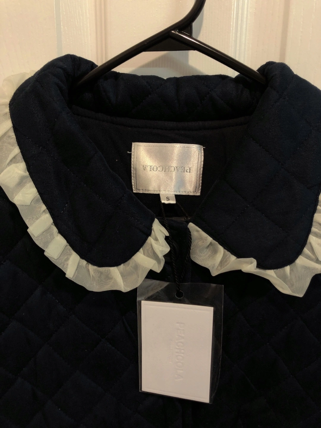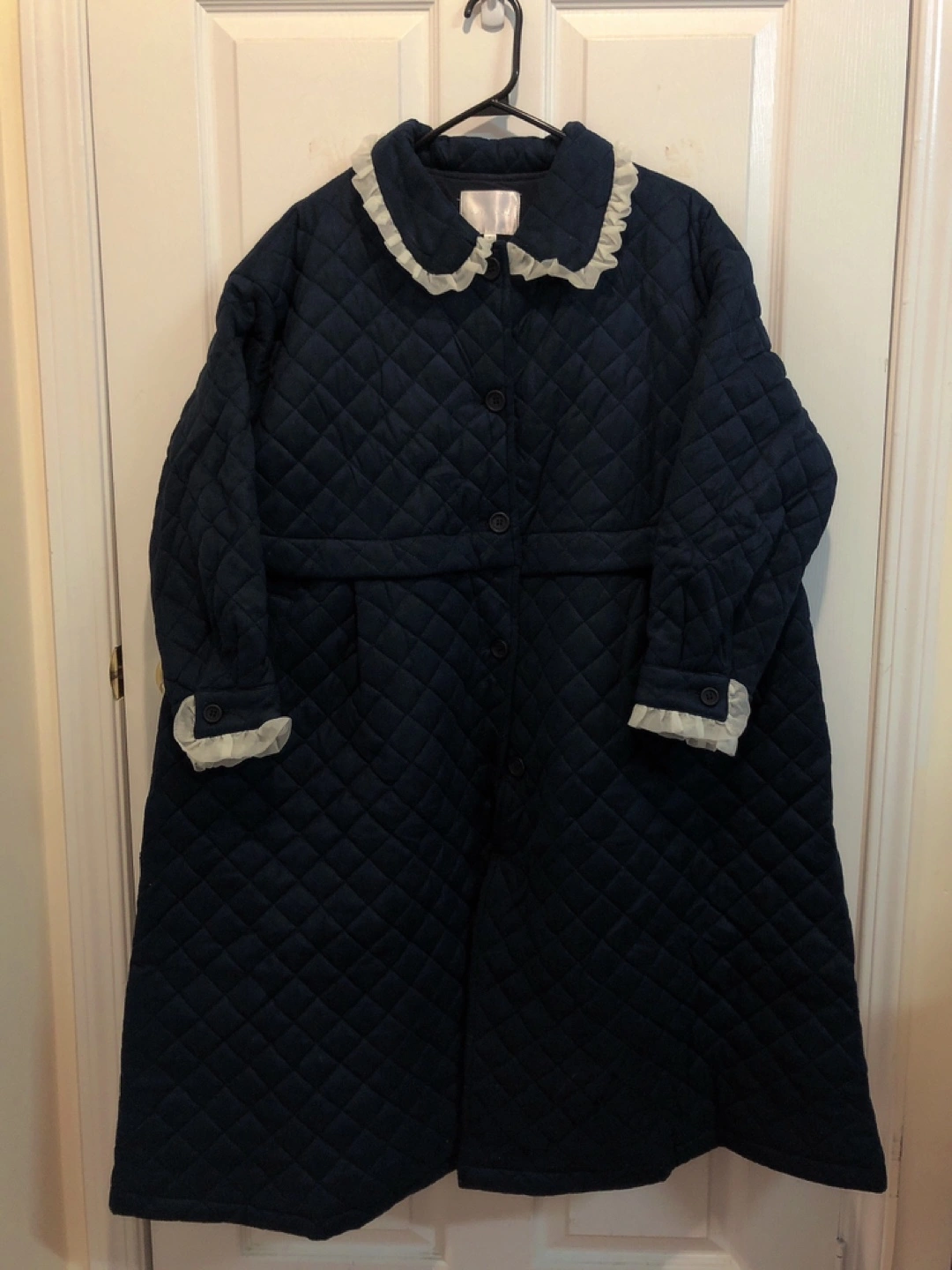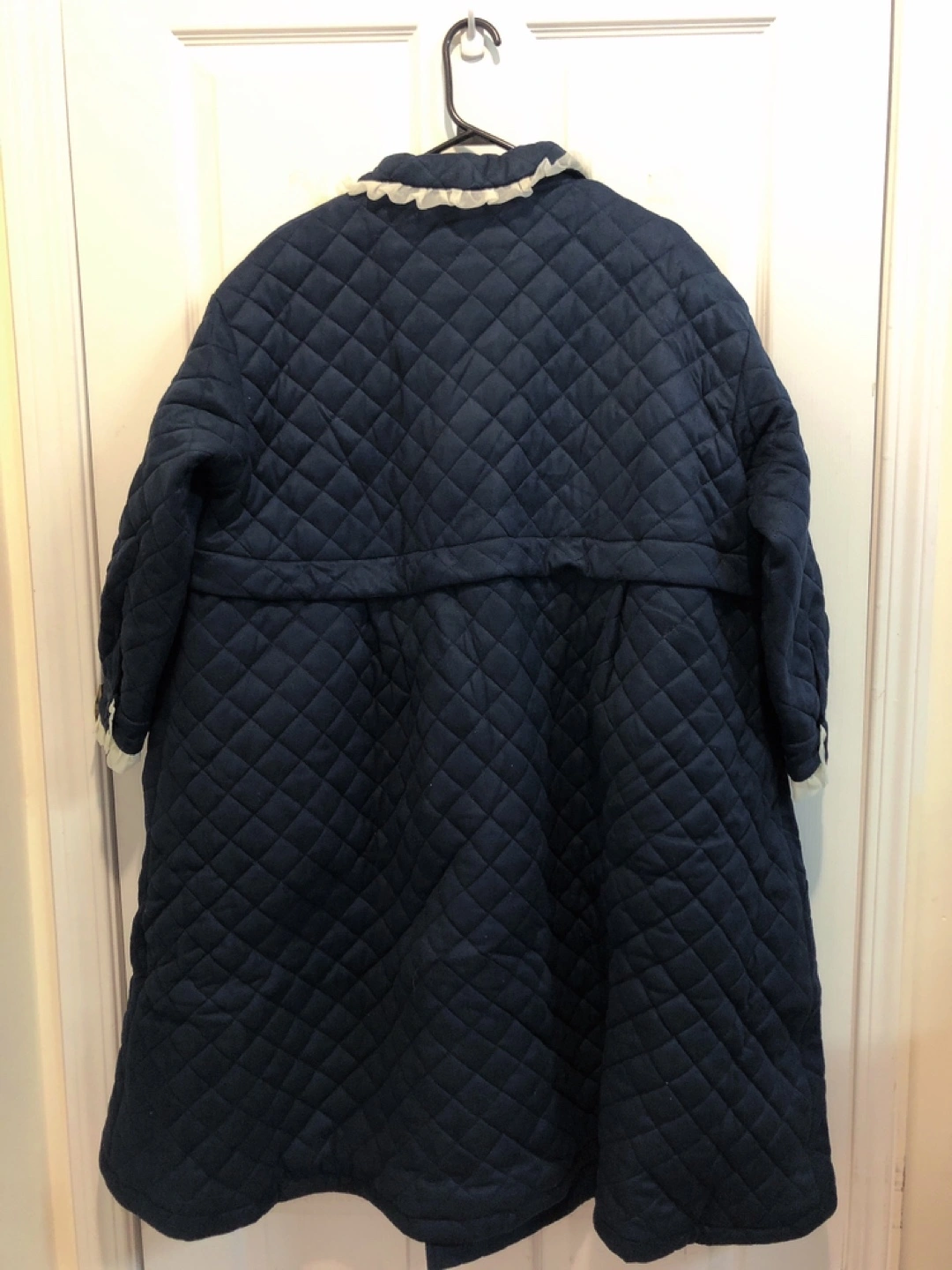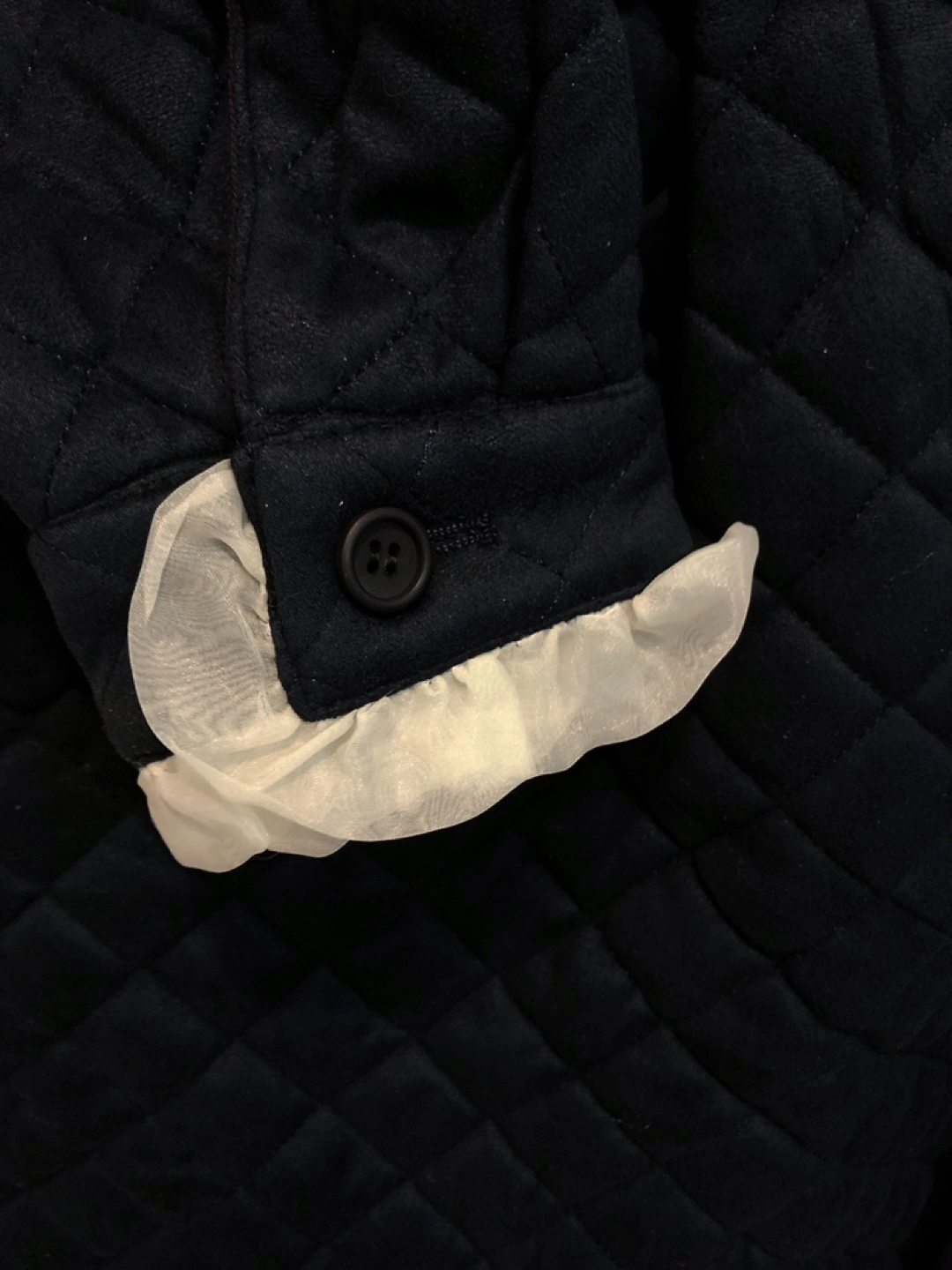 Navy blue quilted jacket with lace trim. Has a button-up front, and long sleeves.