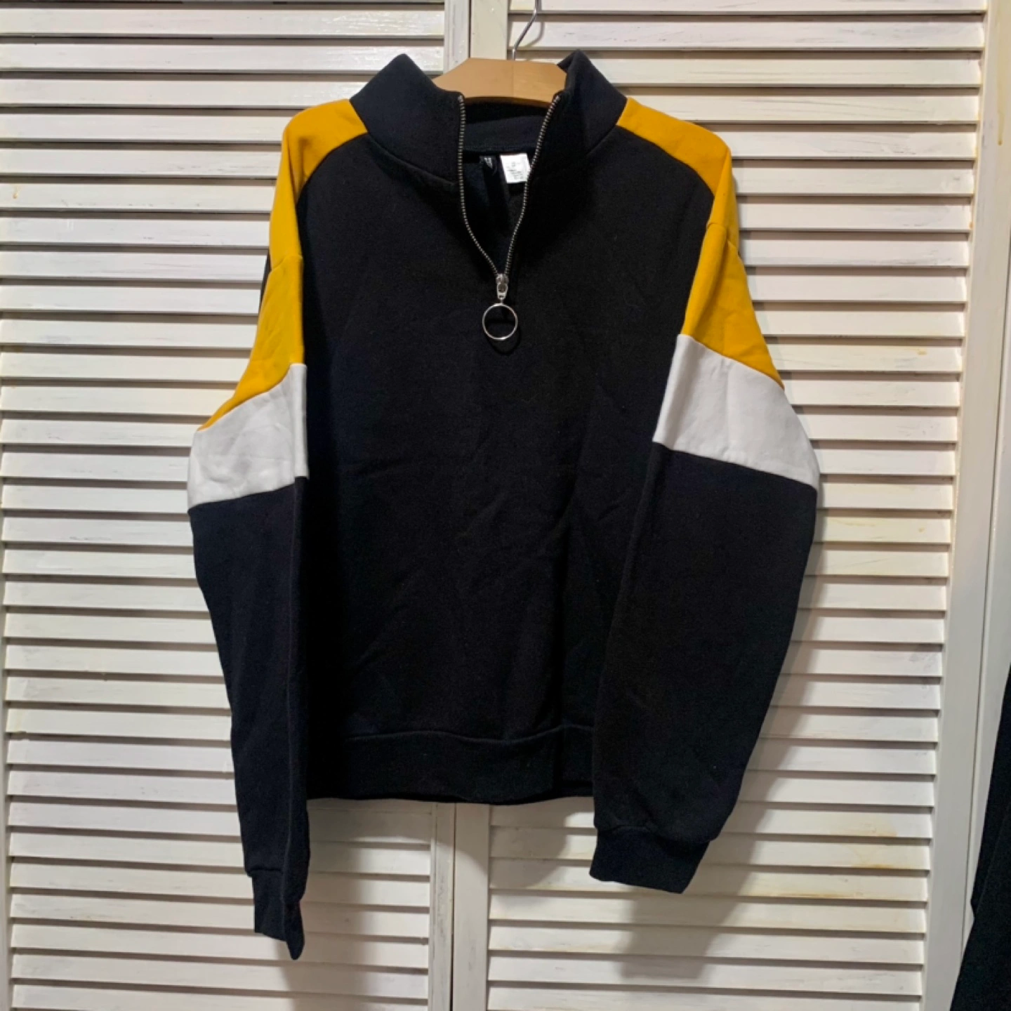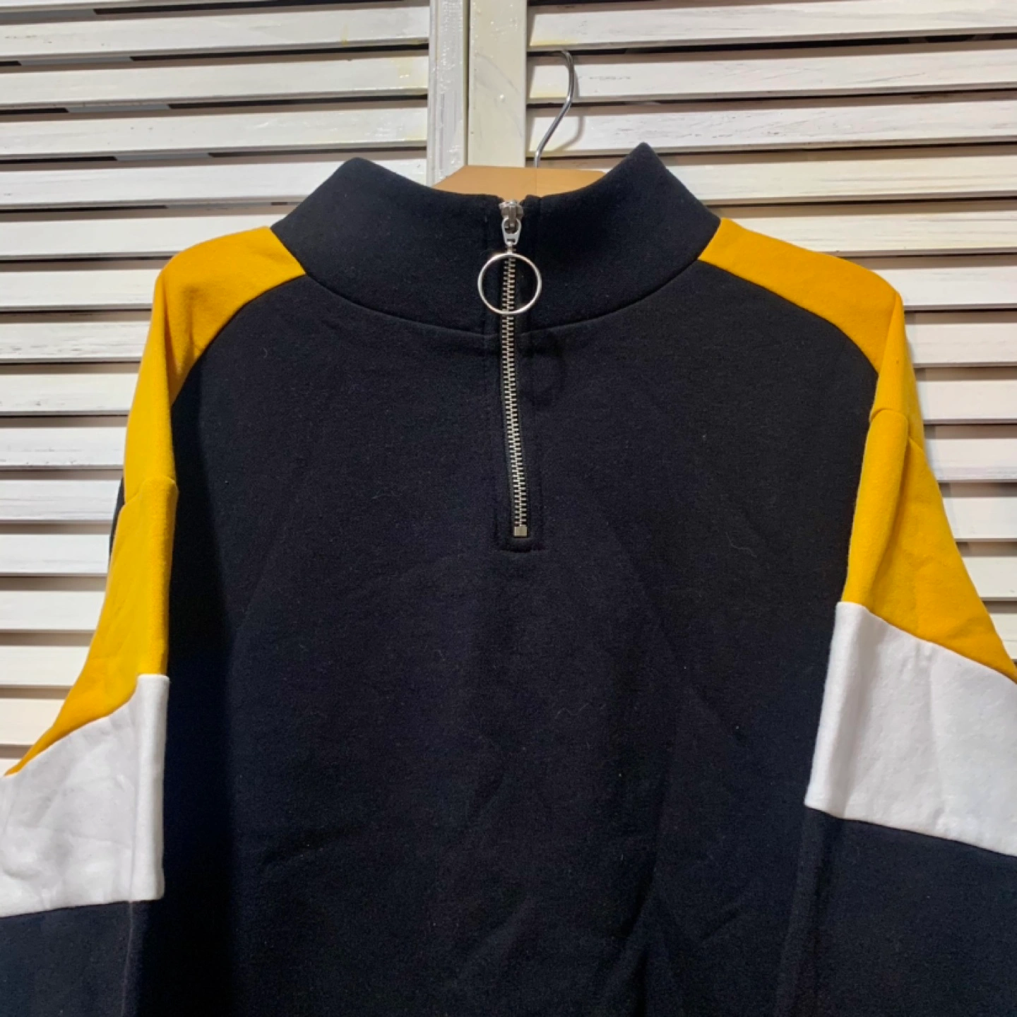 Black sweatshirt with yellow and white color blocking. Half-zip closure. Long sleeves. Mock neck.