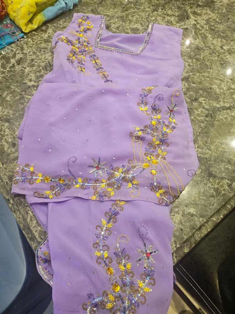 Purple Kurta and Dupatta set with embroidered details. Sleeveless Kurta with a square neckline.