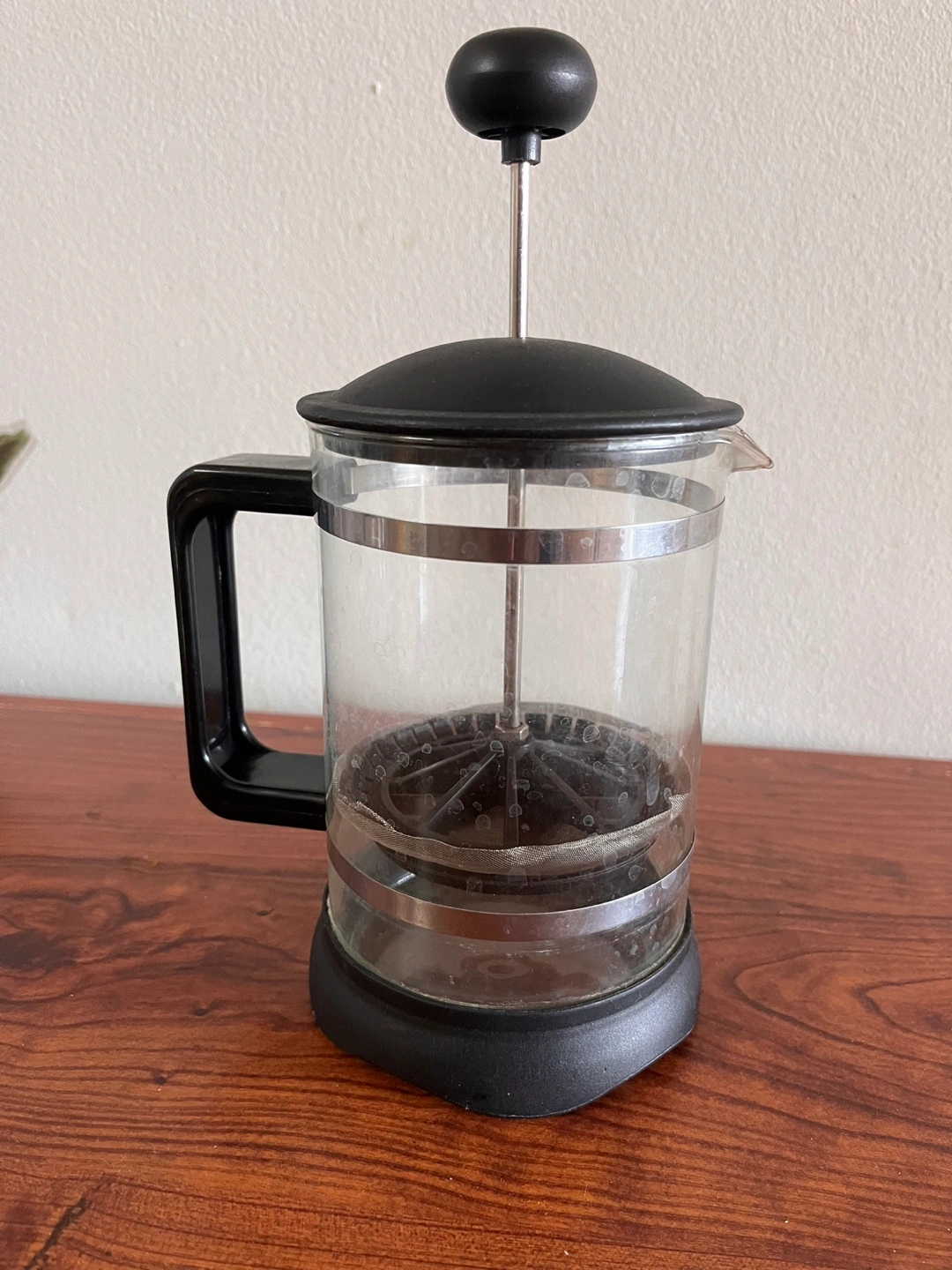 Glass French press coffee maker with a metal mesh filter. Black plastic handle and lid. Includes a metal plunger.
