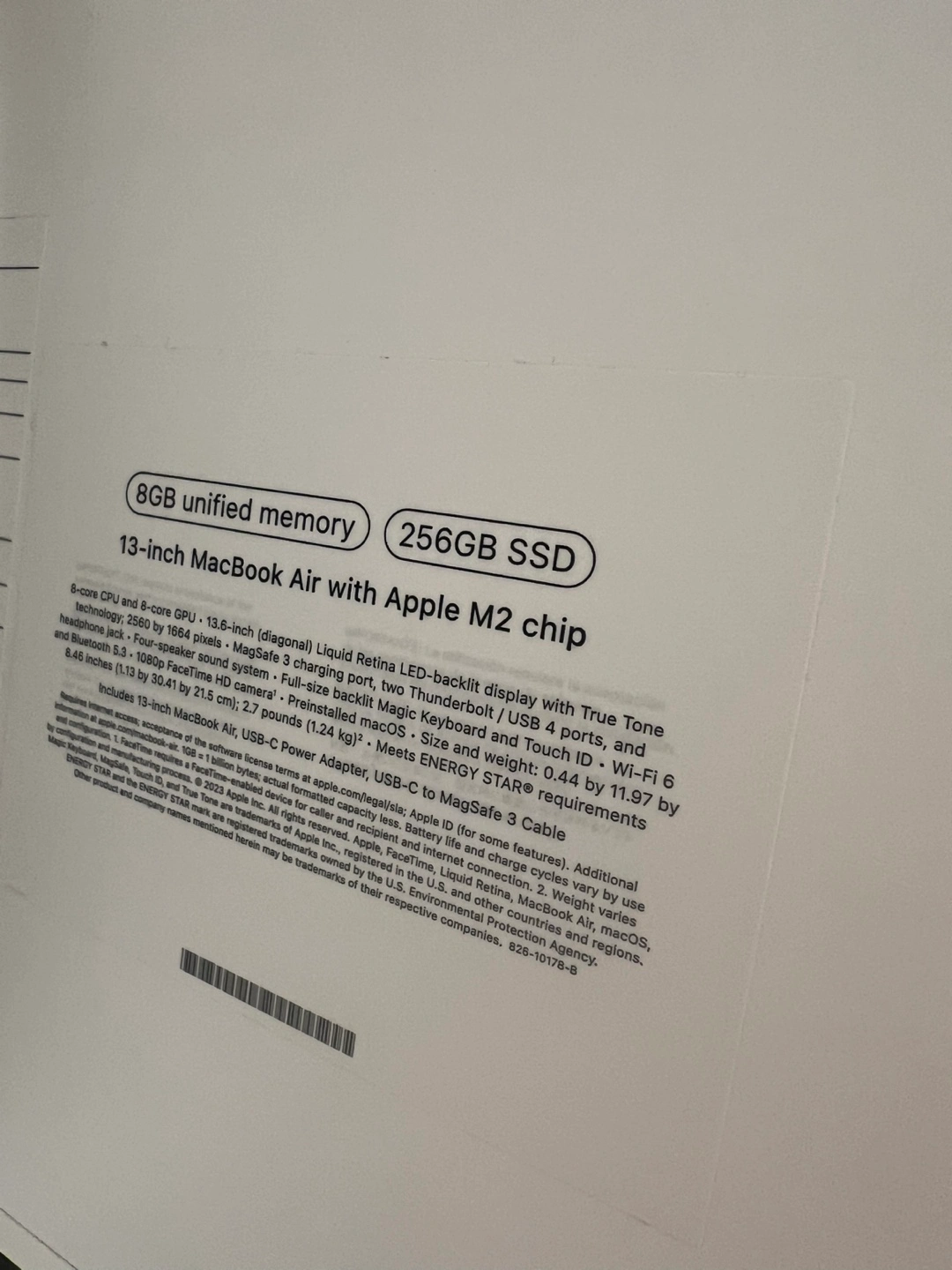 8GB unified memory, 256GB SSD, 13.6-inch Liquid Retina LED-backlit display with True Tone, 8-core CPU and 8-core GPU, Touch ID, backlit keyboard and Touch ID. 0.44 by 11.97 by 8.43 inches, 2.7 pounds (1.24 kg)