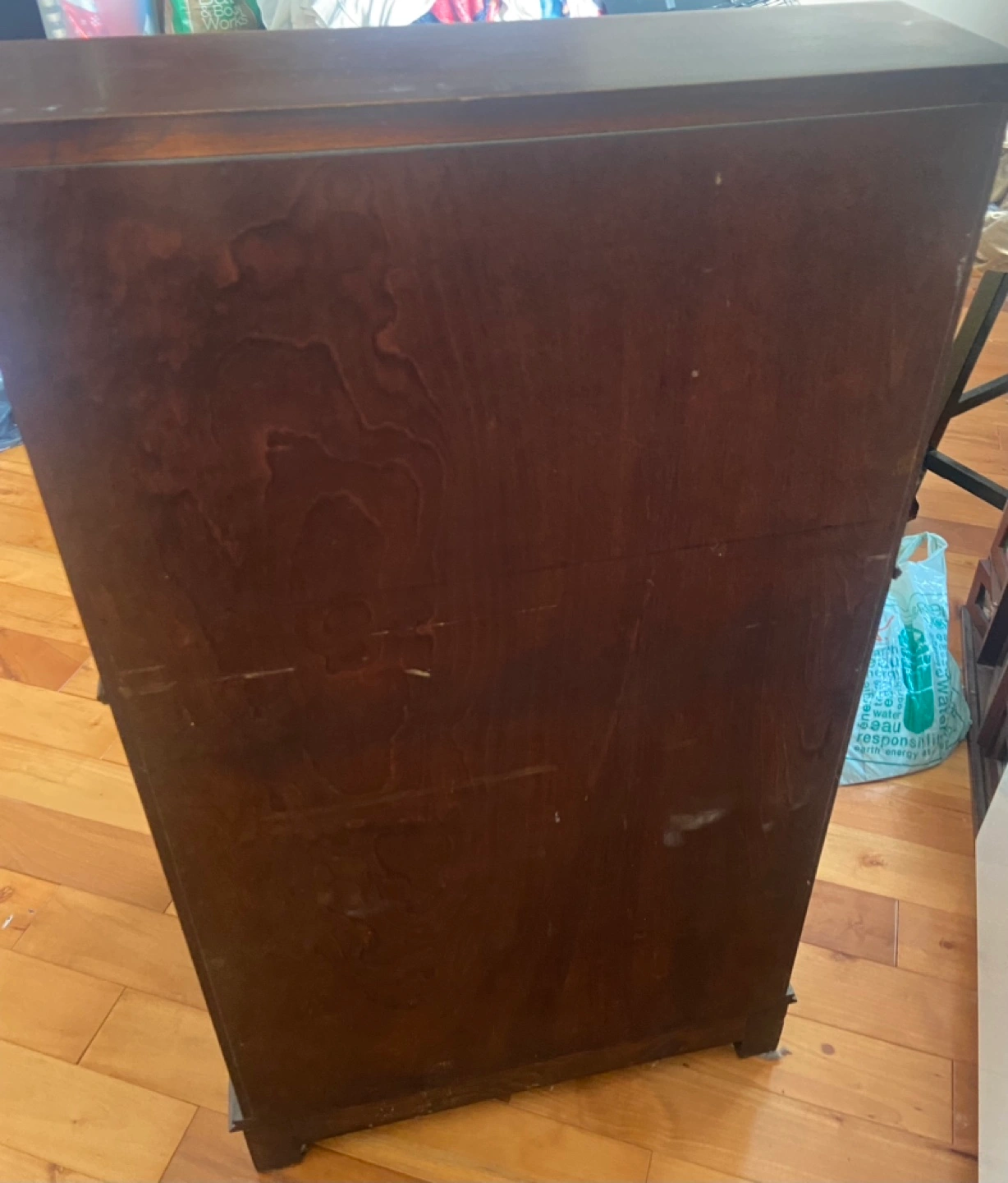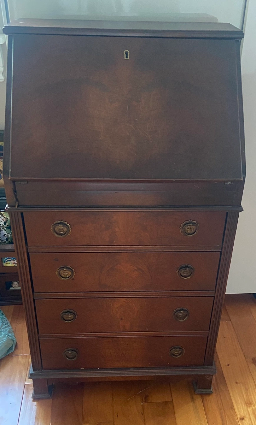 Solid wood secretary desk with four drawers and a drop-down writing surface. The desk has a keyhole for a lock, but does not come with a key.
