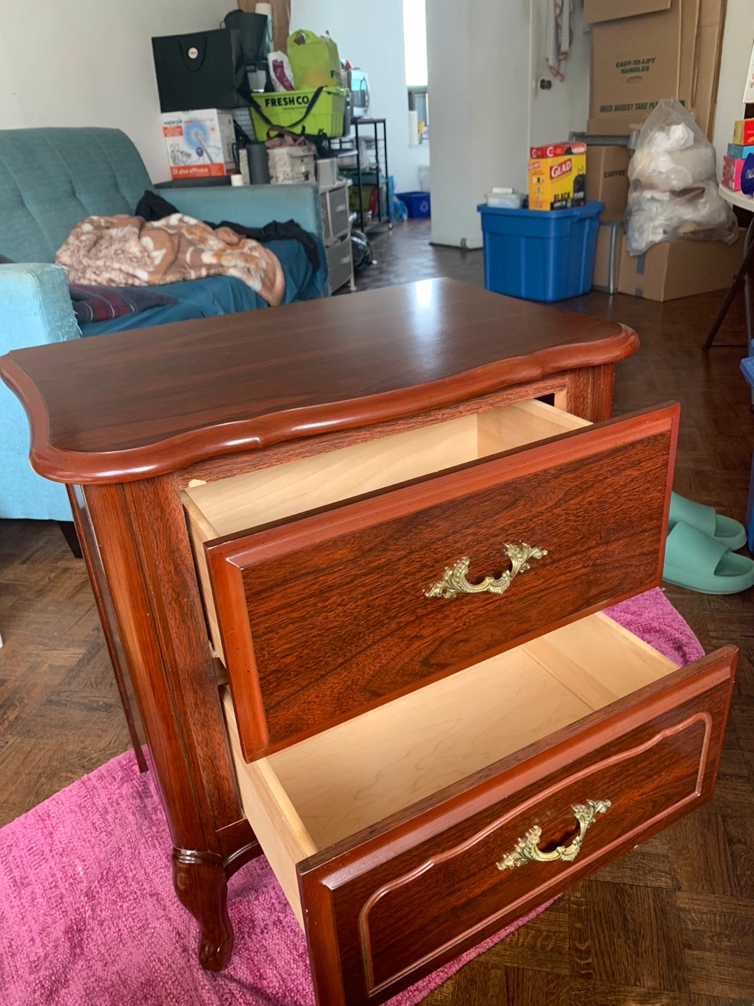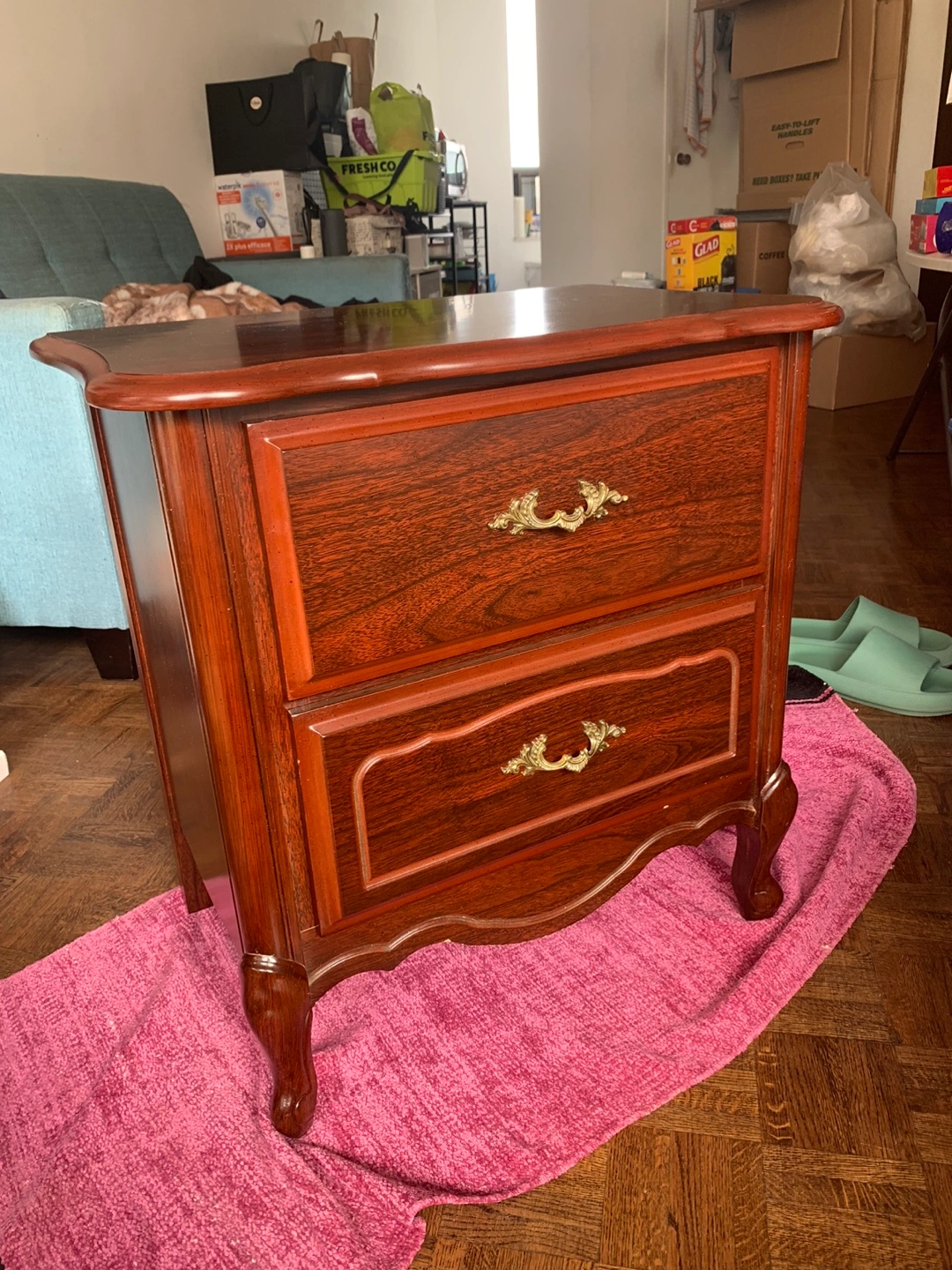 Two-drawer nightstand. Solid wood with a dark wood finish (none of that particle board Ikea stuff). Ornate brass hardware. Good condition. Slight wear and tear on the finish.