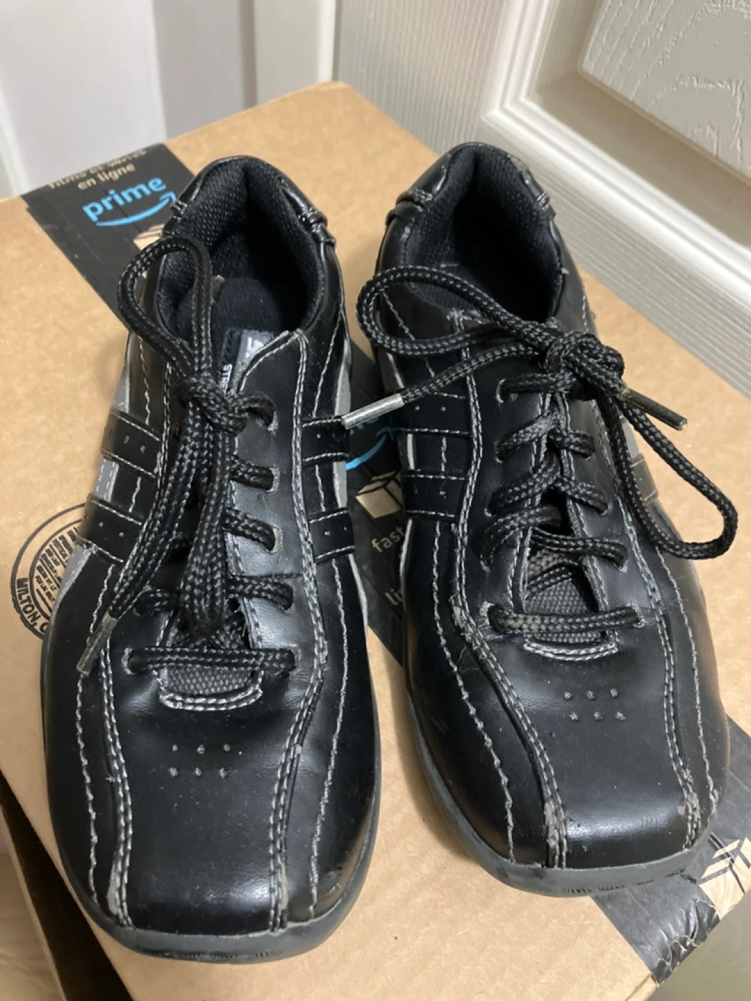 Black running shoes with grey accents. Lace-up closure. Boys size 1 (fits 8+ yrs old)