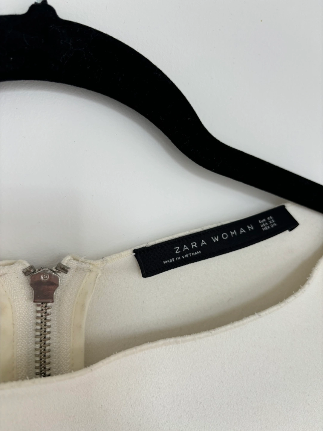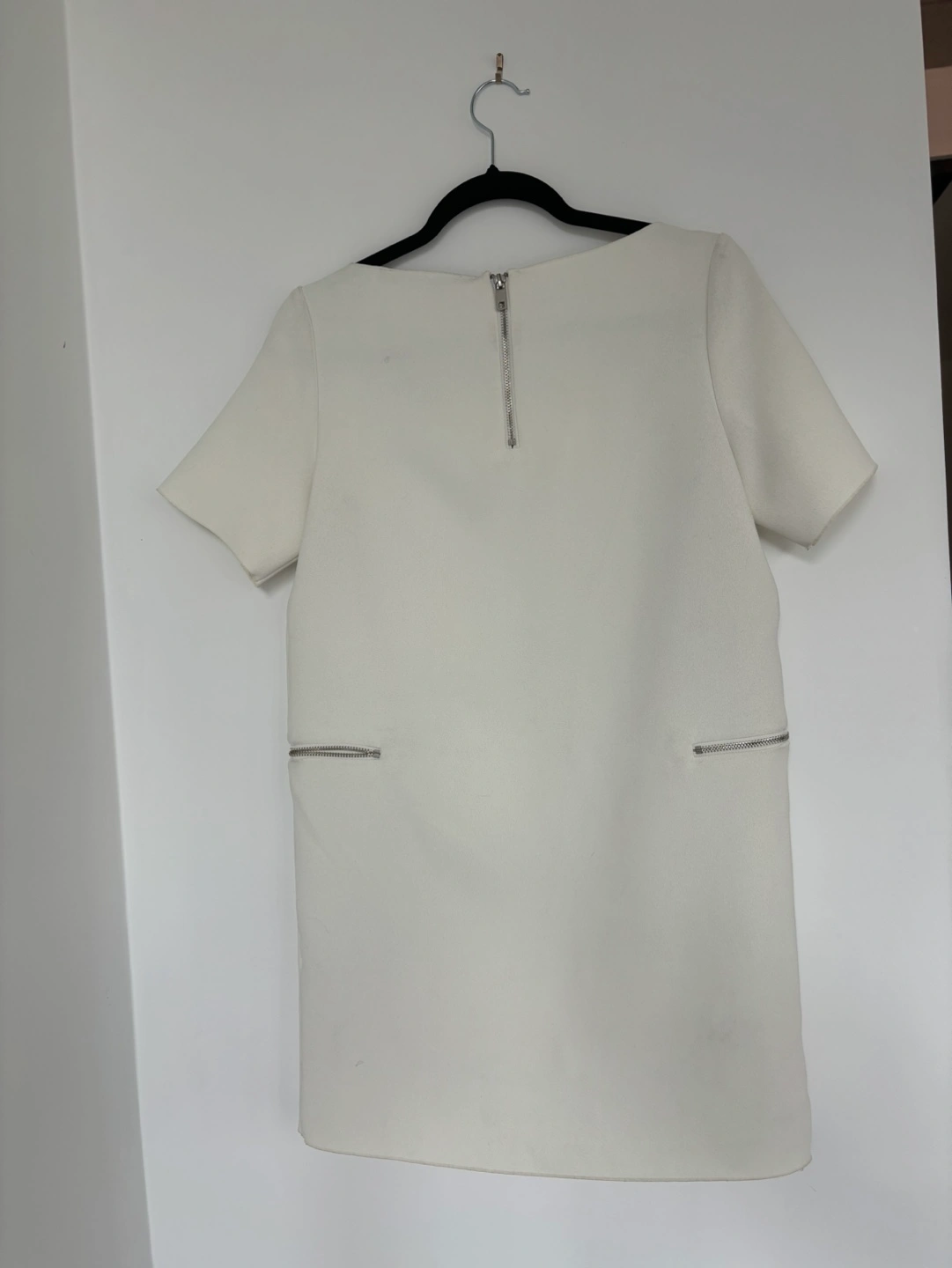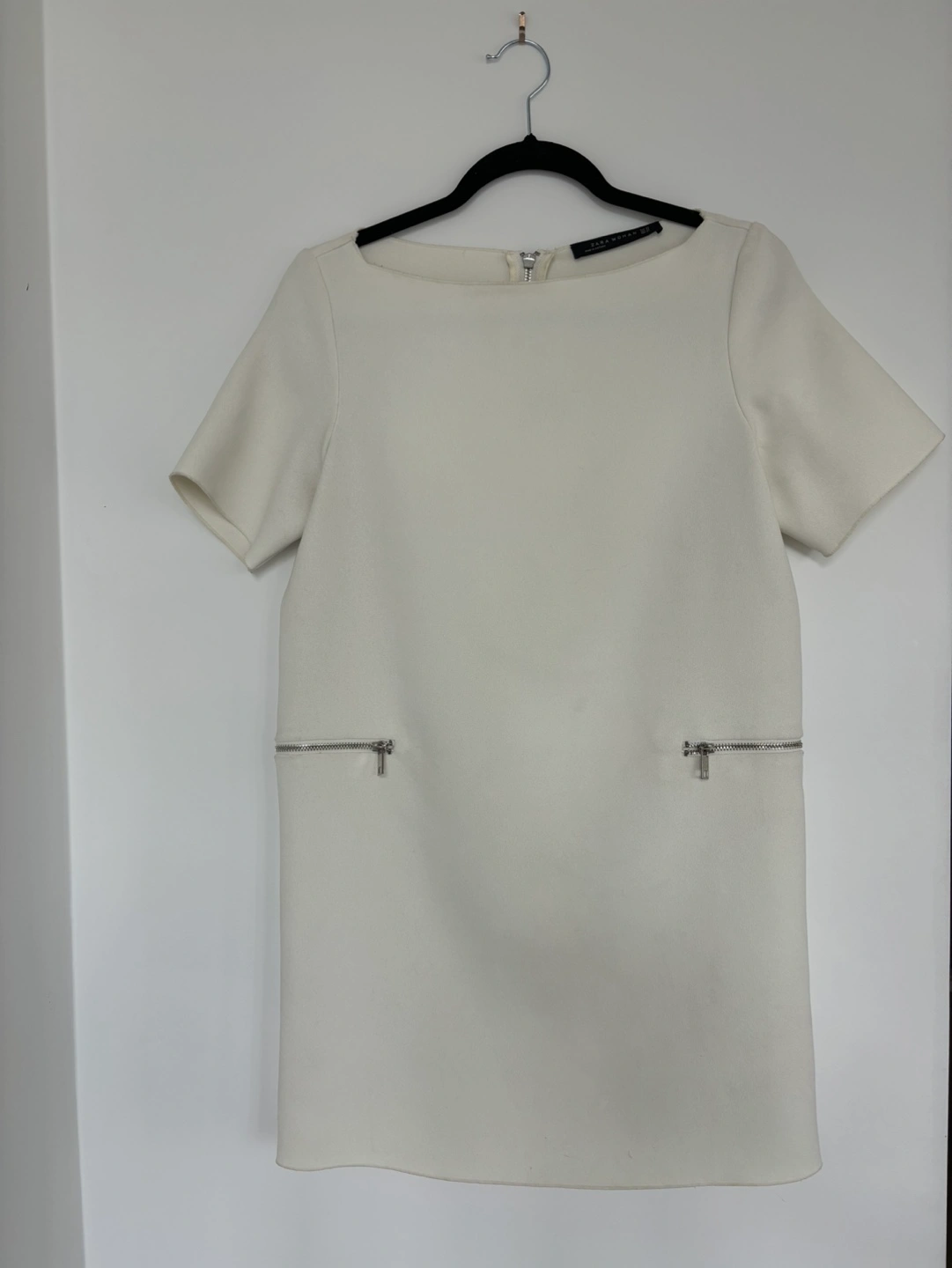 White short sleeve tunic dress with zipper details. Zipper at back.