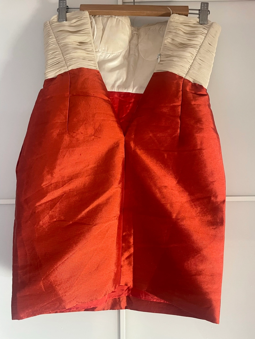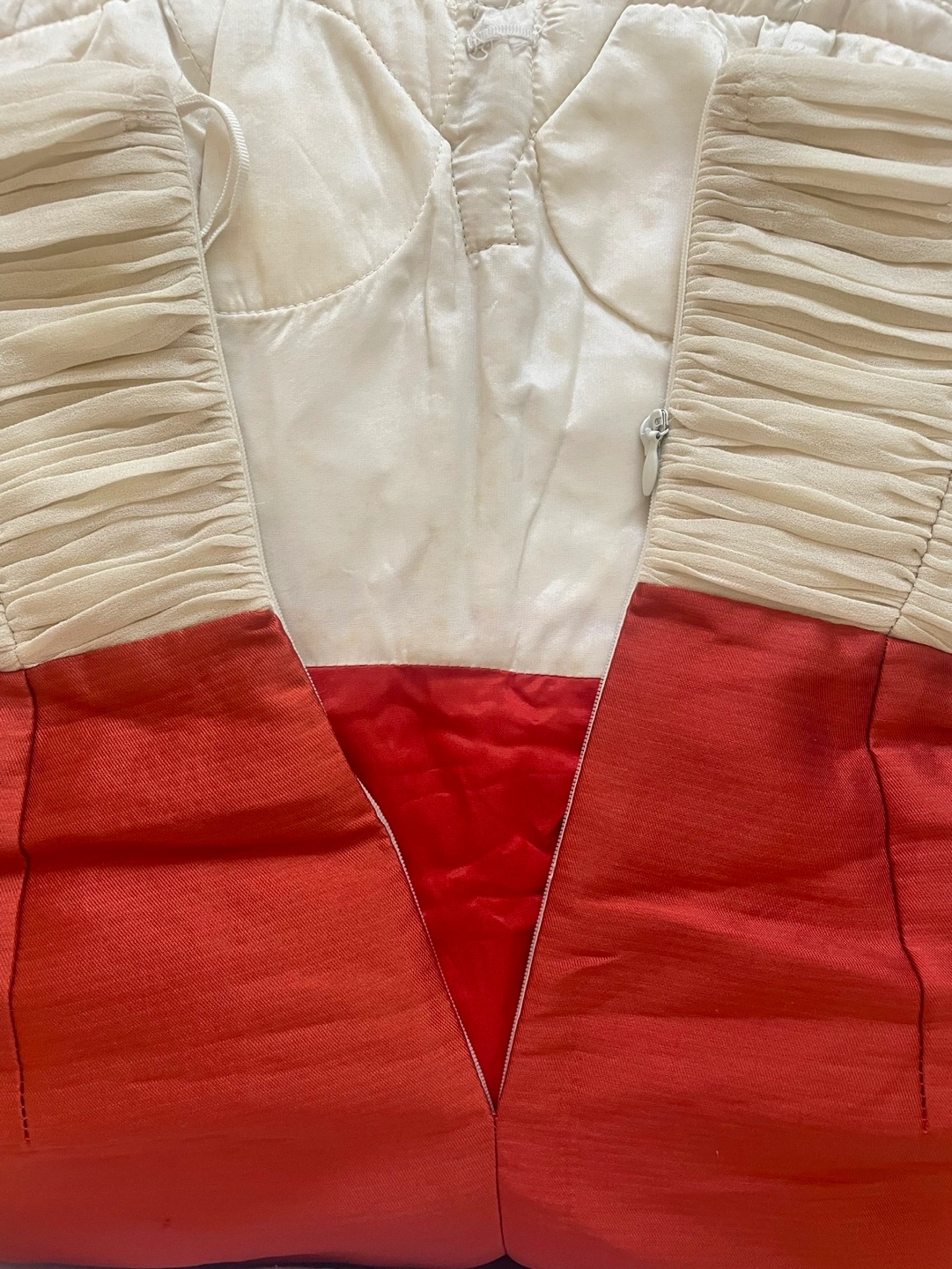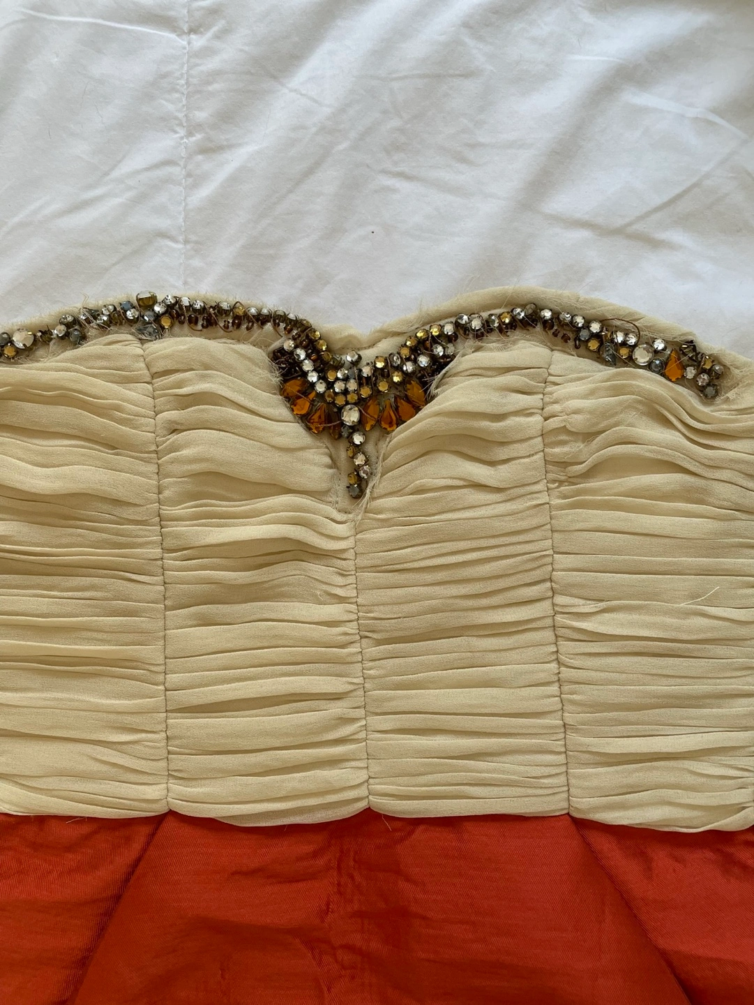 Strapless dress, white bodice, red skirt. Beaded embellishment at the neckline. Size XXS (fits like XS)