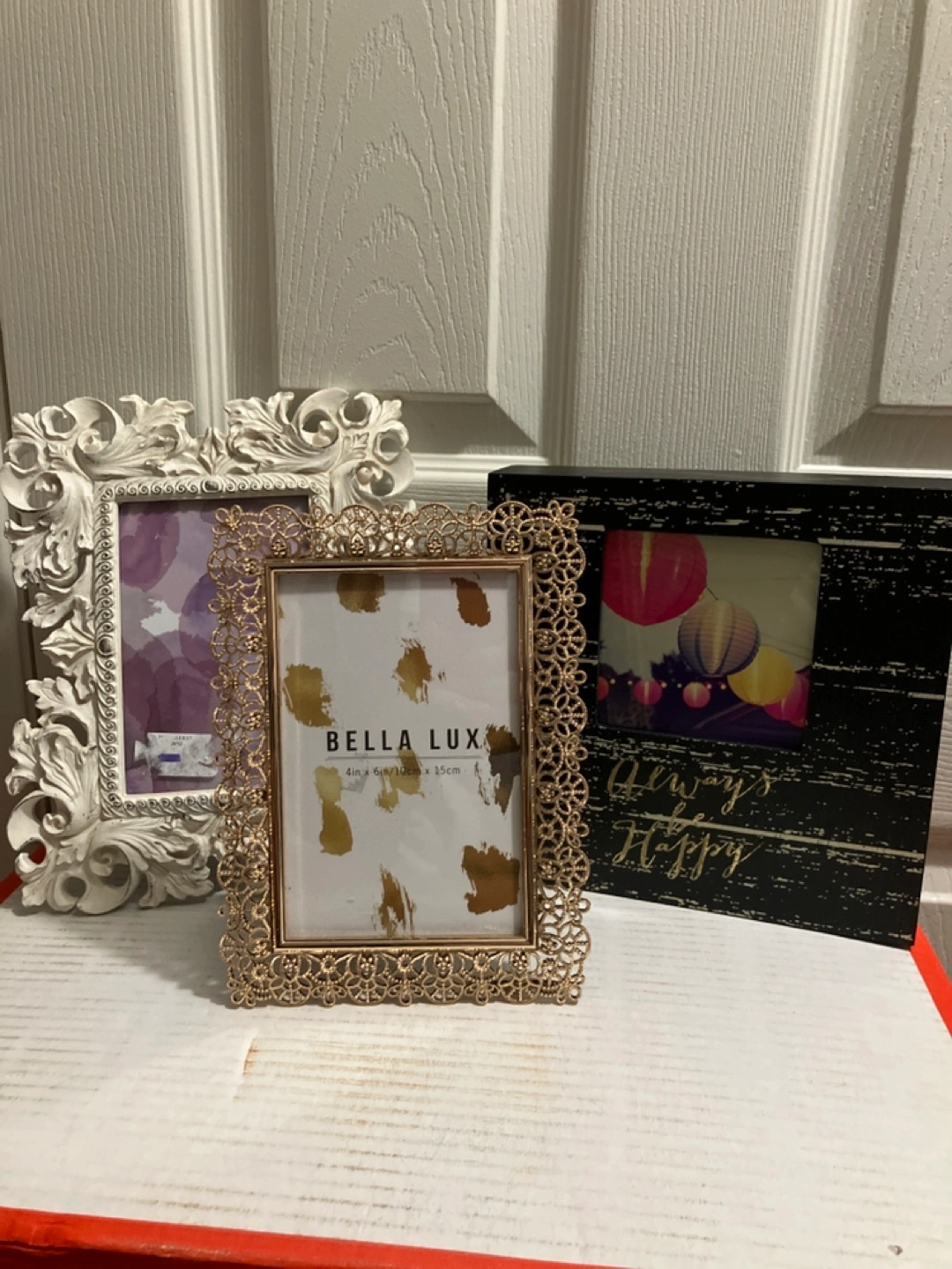 Three picture frames. White frame (8x10) with ornate detail, Bella Lux (4x6) , Black with gold writing (8x10)