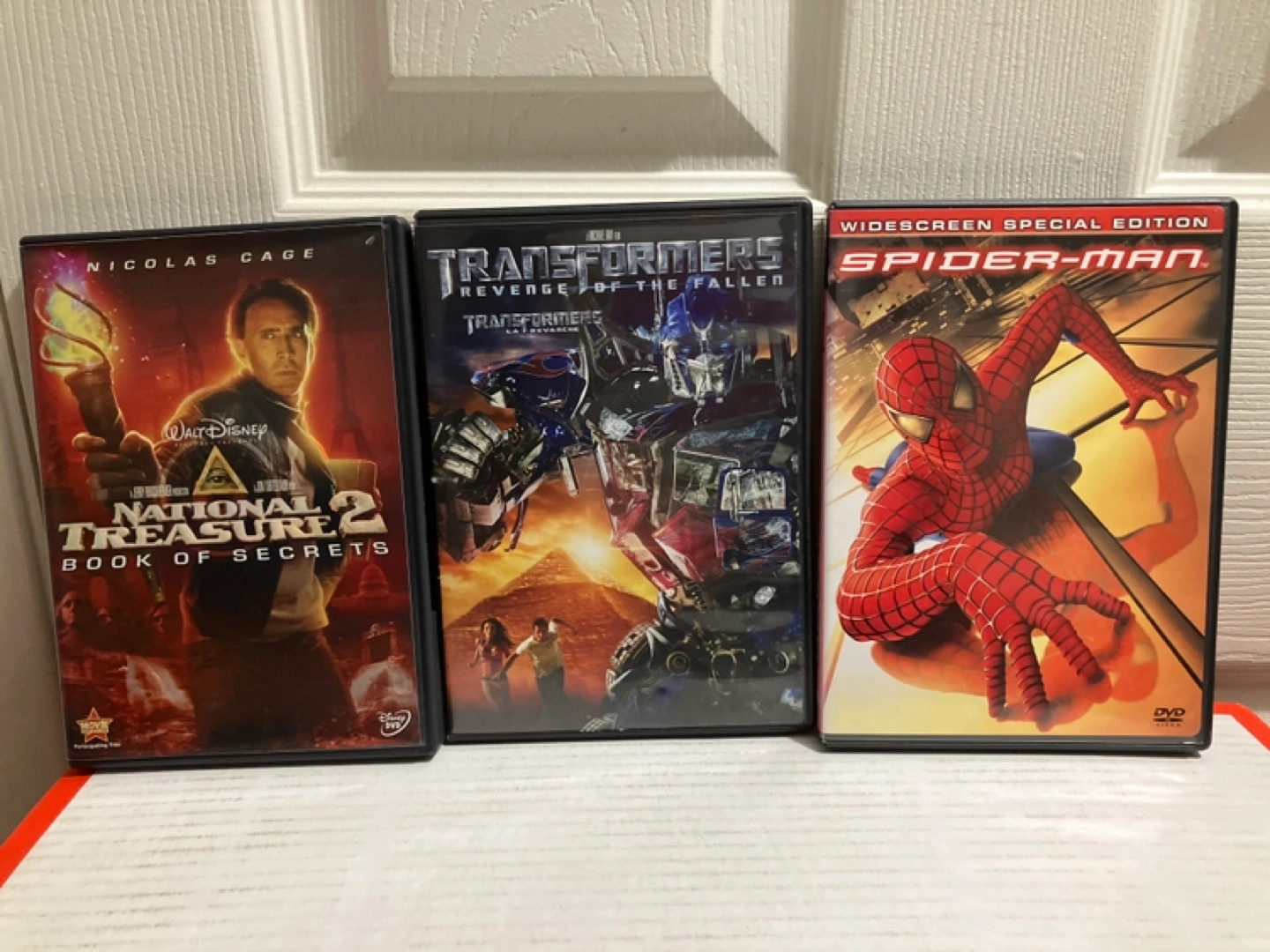 2103 DVD movies: National Treasure 2, Transformers: Revenge of the Fallen, and Spider-Man. Asking $10 for all