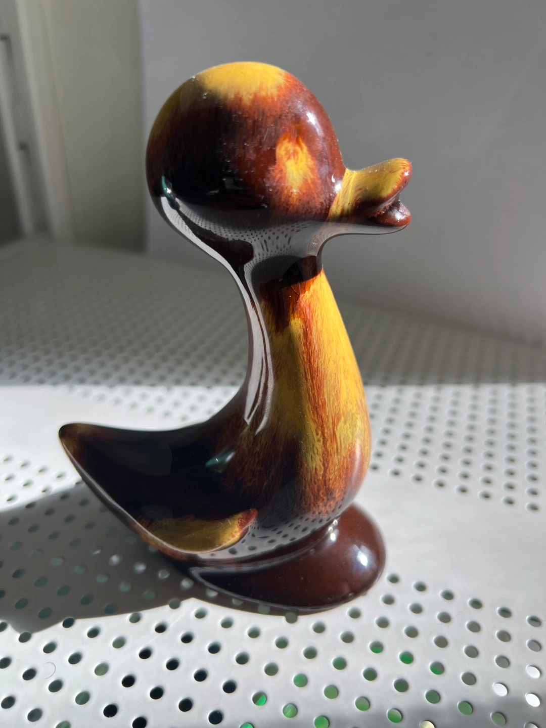 Brown and yellow glazed ceramic duck figurine possibly by Blue Mountain Pottery. I purchased him in Canada where BMP is located and the glaze and technique matches their pieces but it is not marked.