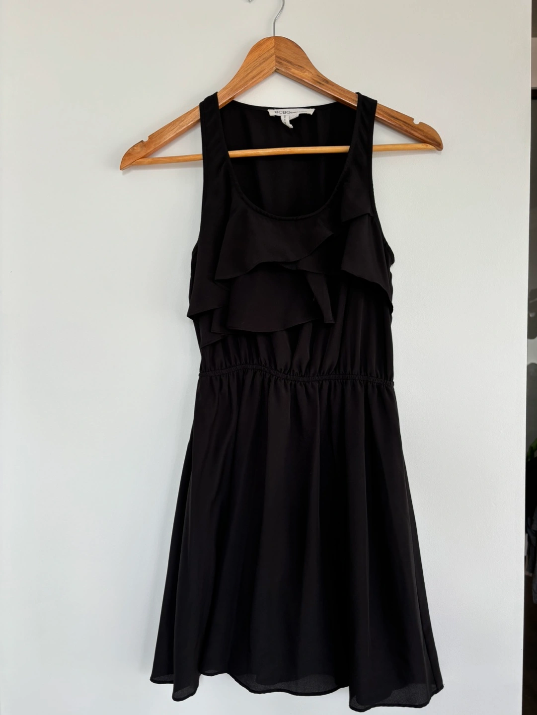 Black sleeveless dress with ruffles at the top and an elastic waistband. Size XXS but fits like XS
