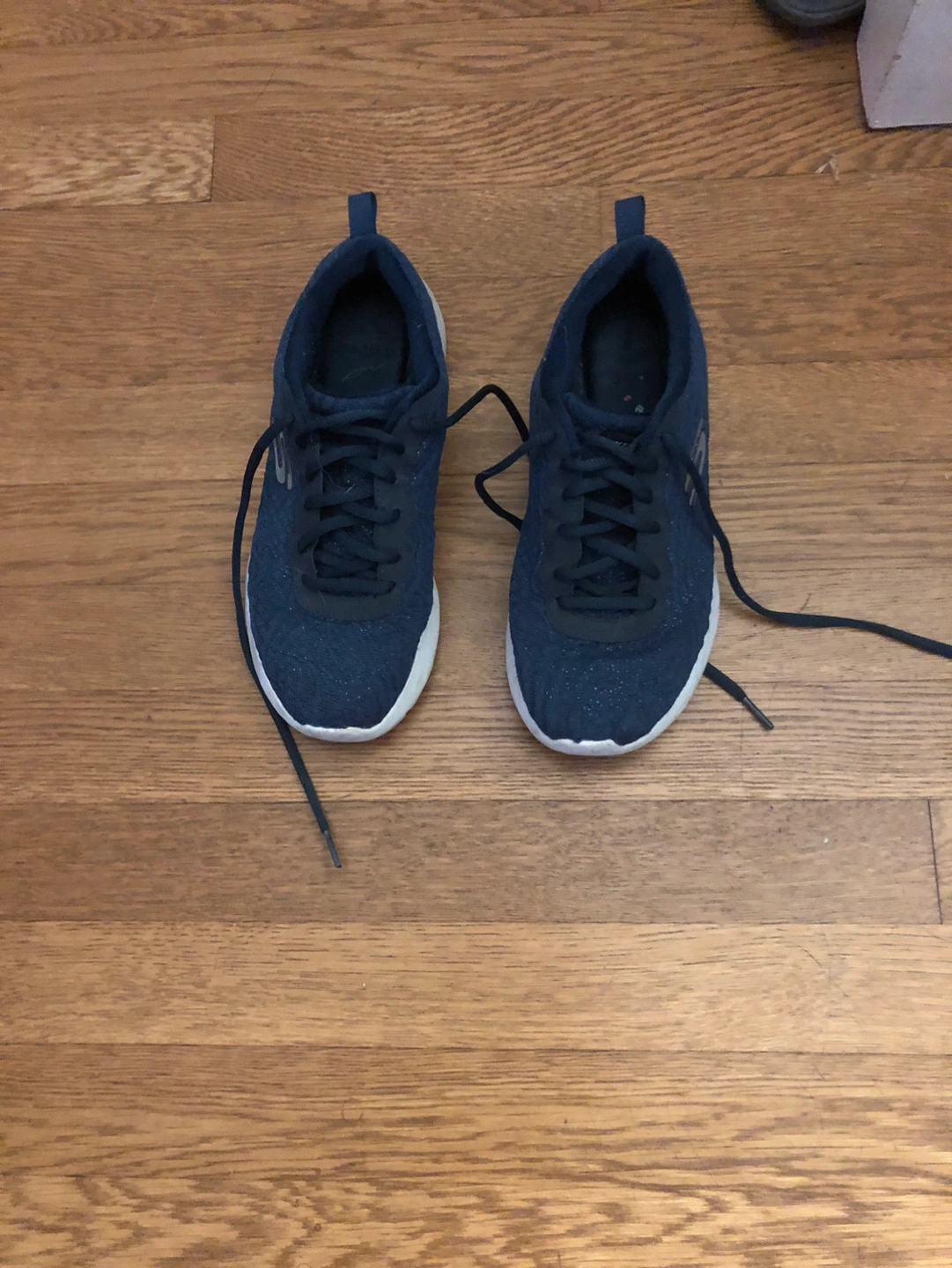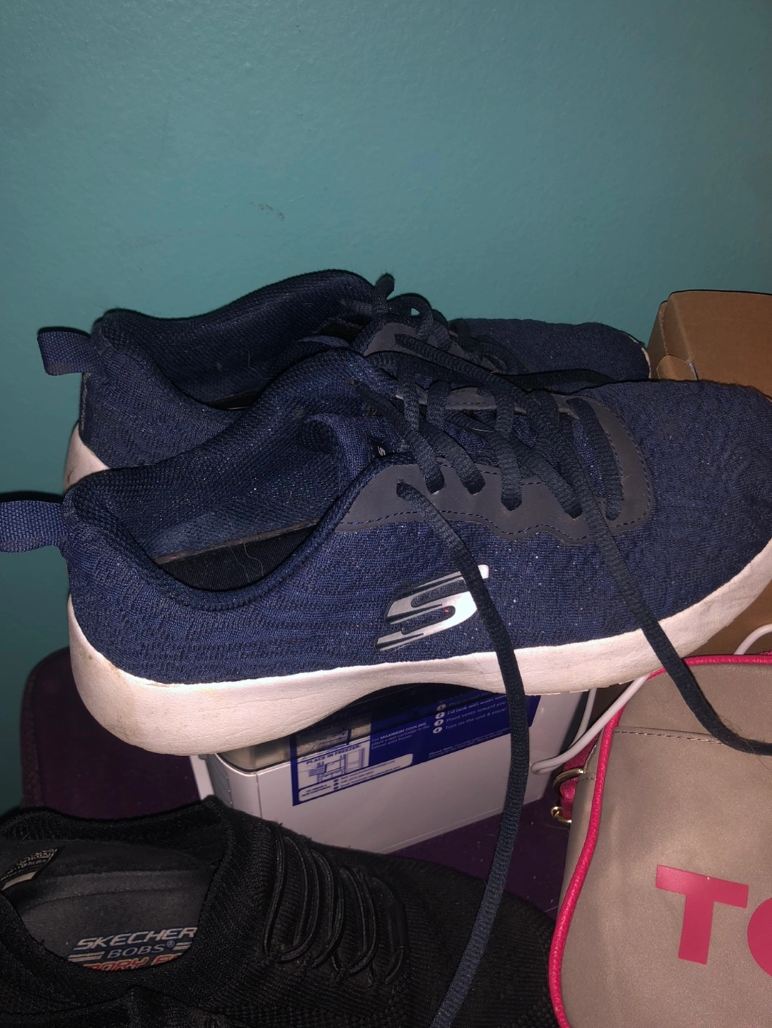 Women's navy blue Skechers sneakers with white soles. Lace-up closure. Size 6