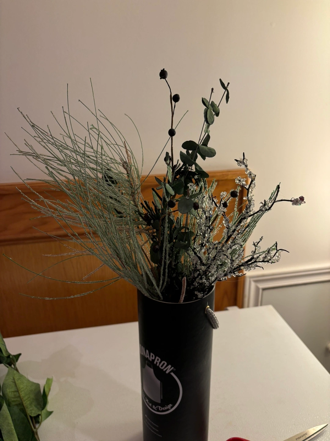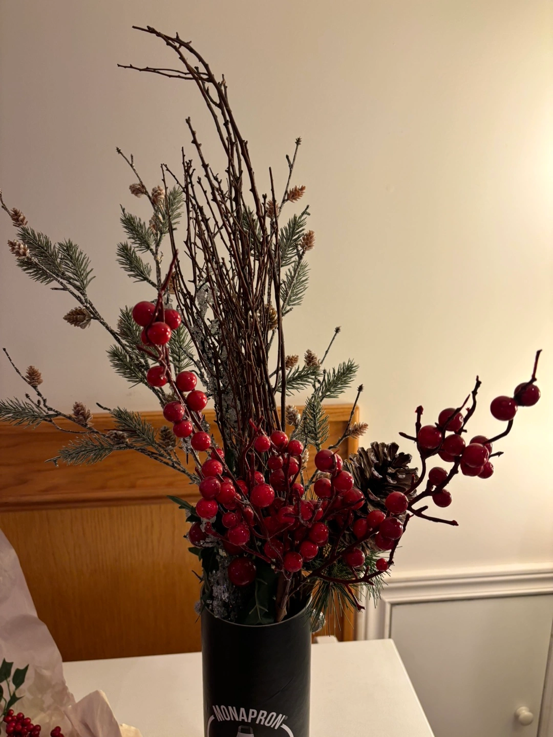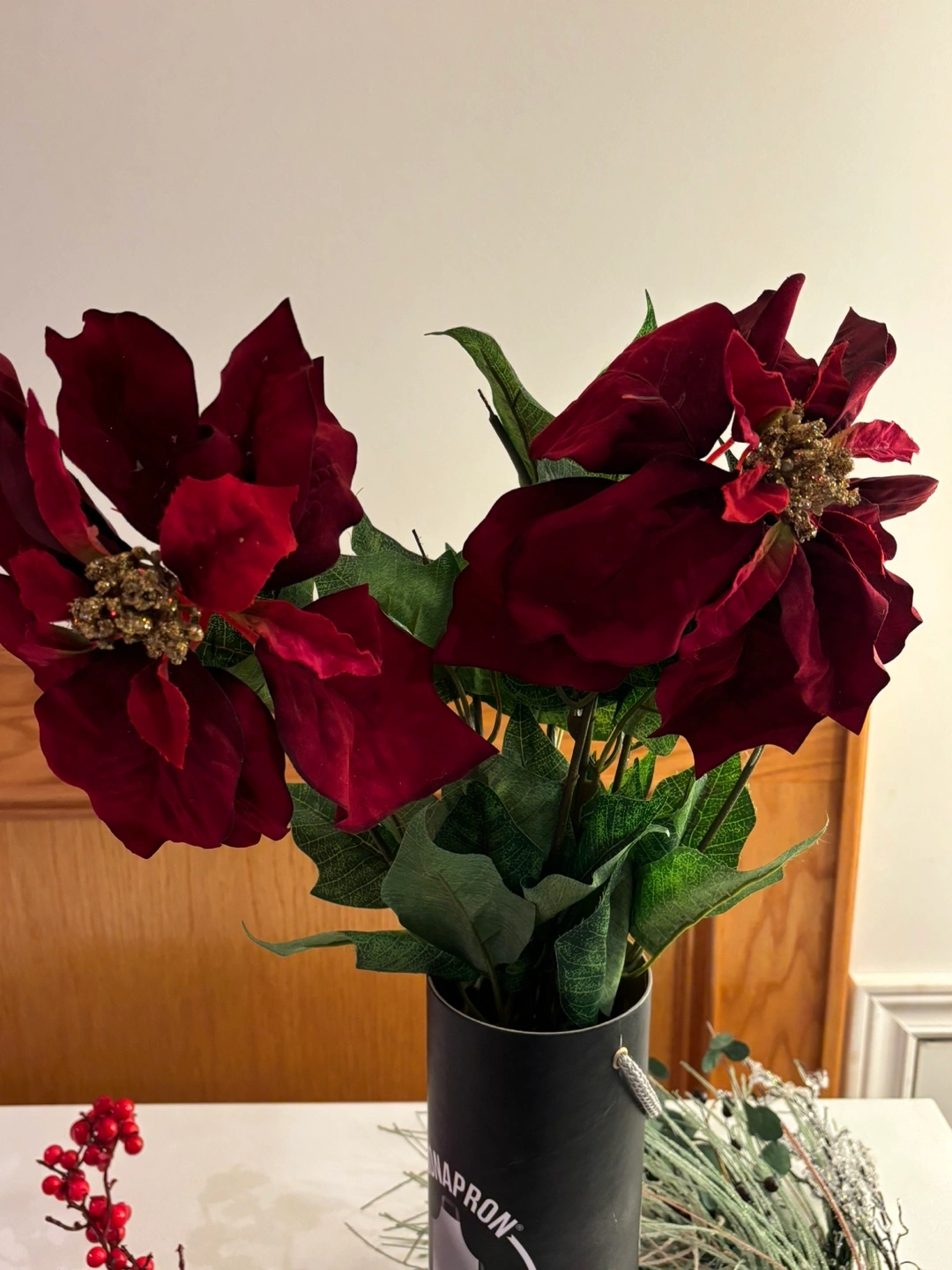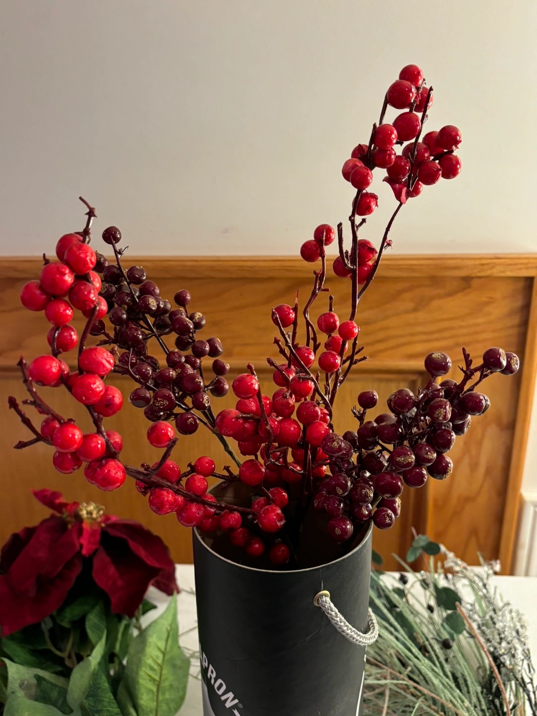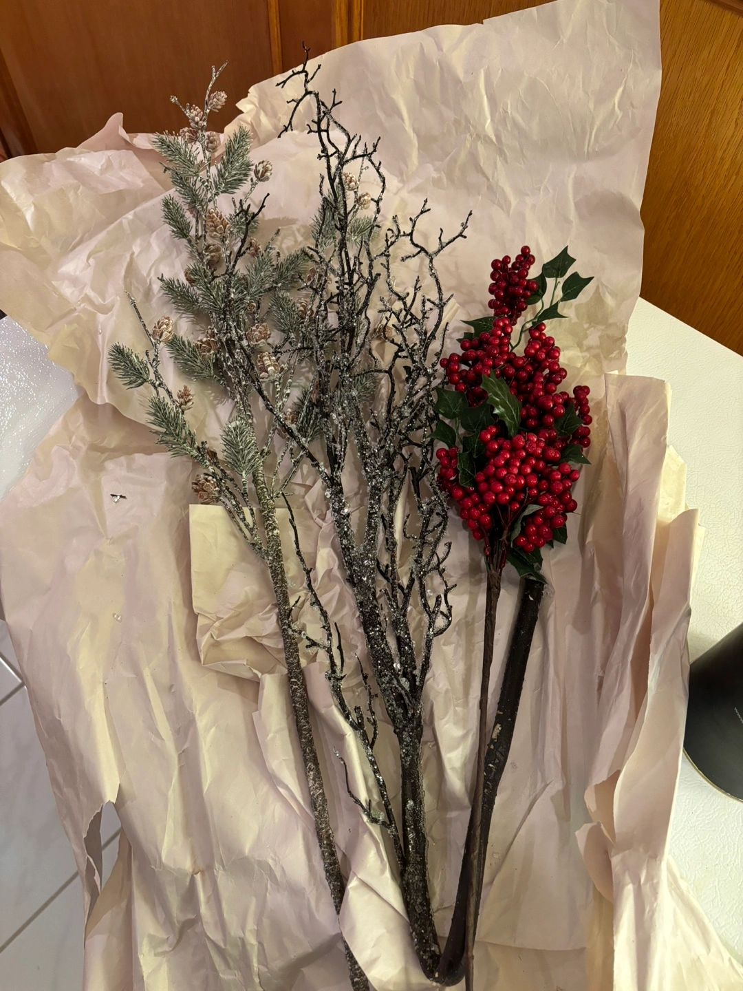 Set of five Christmas decorations. Includes red berry sprigs, pine sprigs, frosted branches, and two poinsettia sprigs. Can be used in a variety of arrangements.