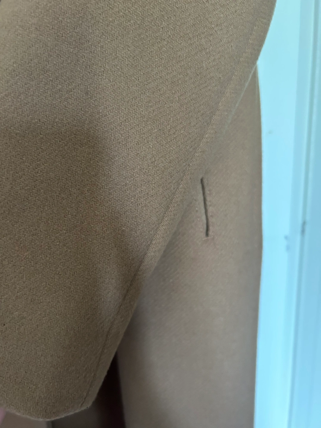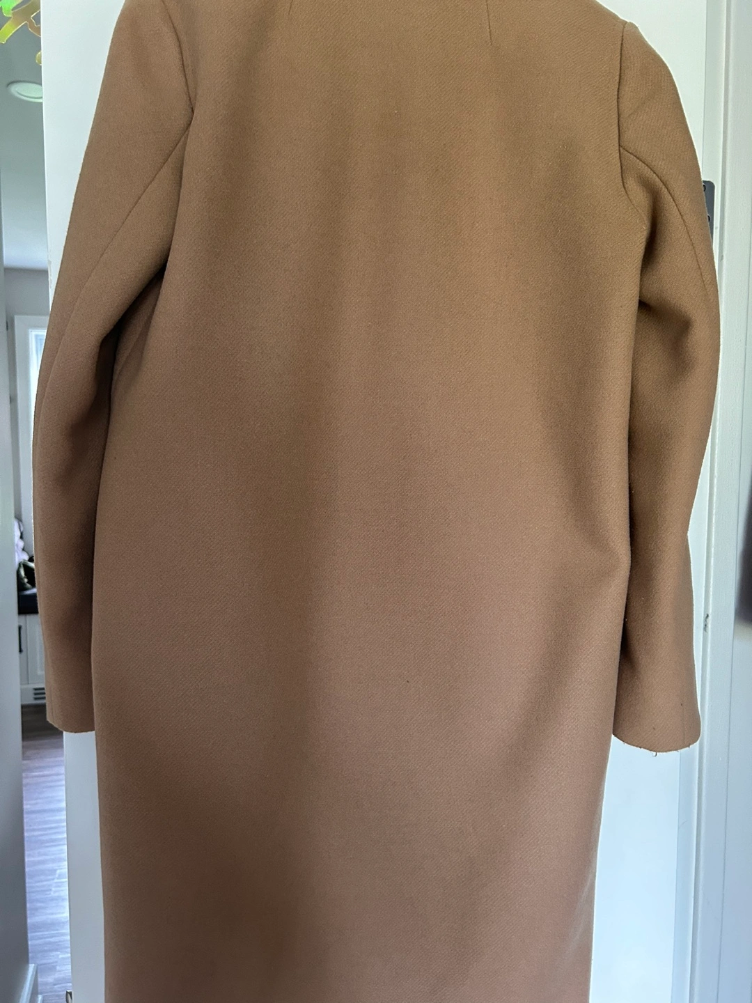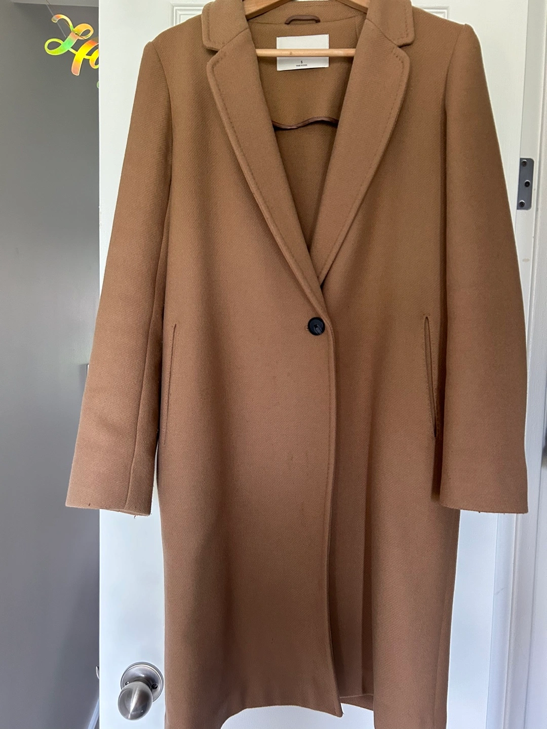 1000+Long camel wool coat with a single button closure. Has two pockets on the sides. Excellent condition.