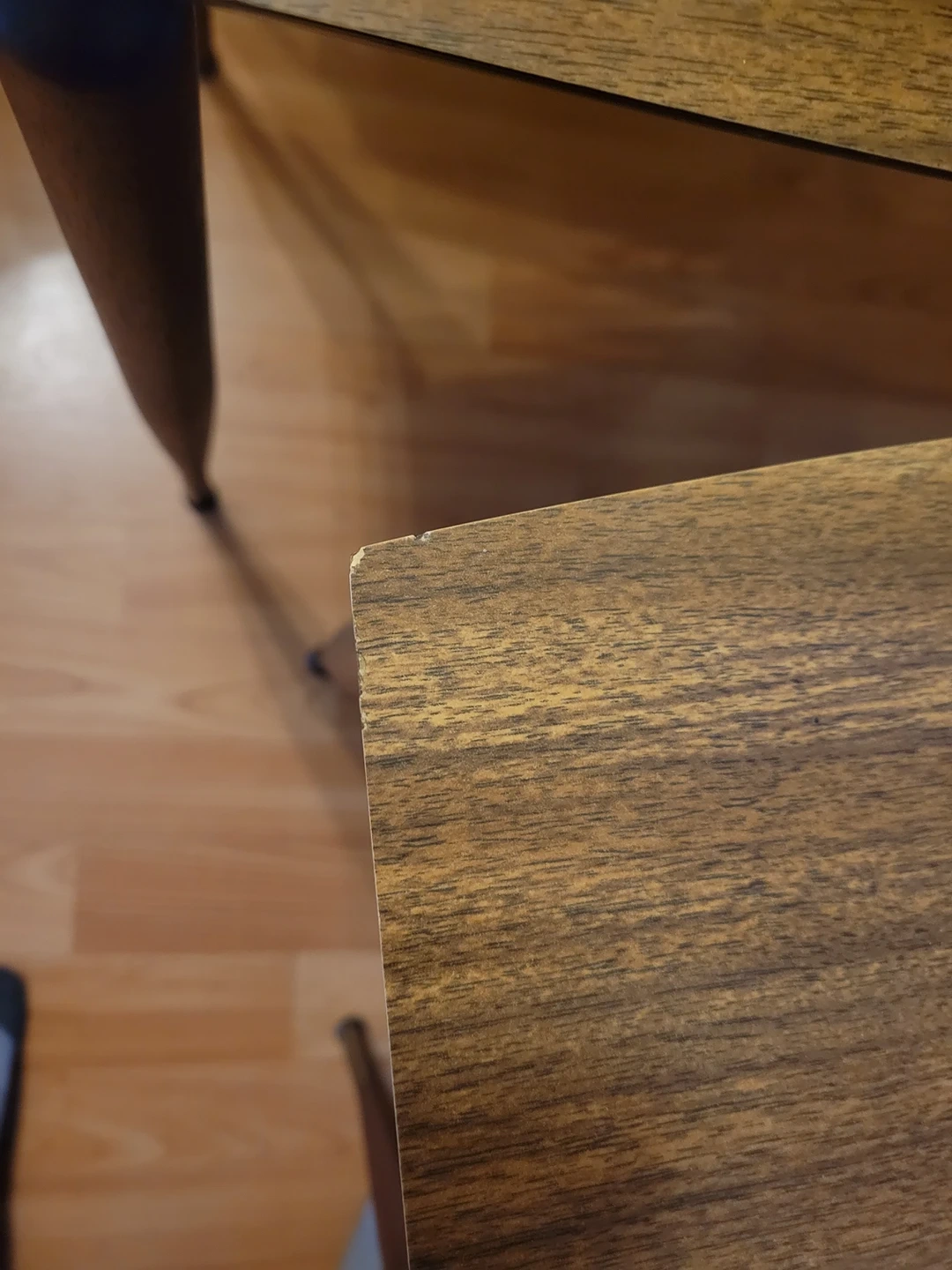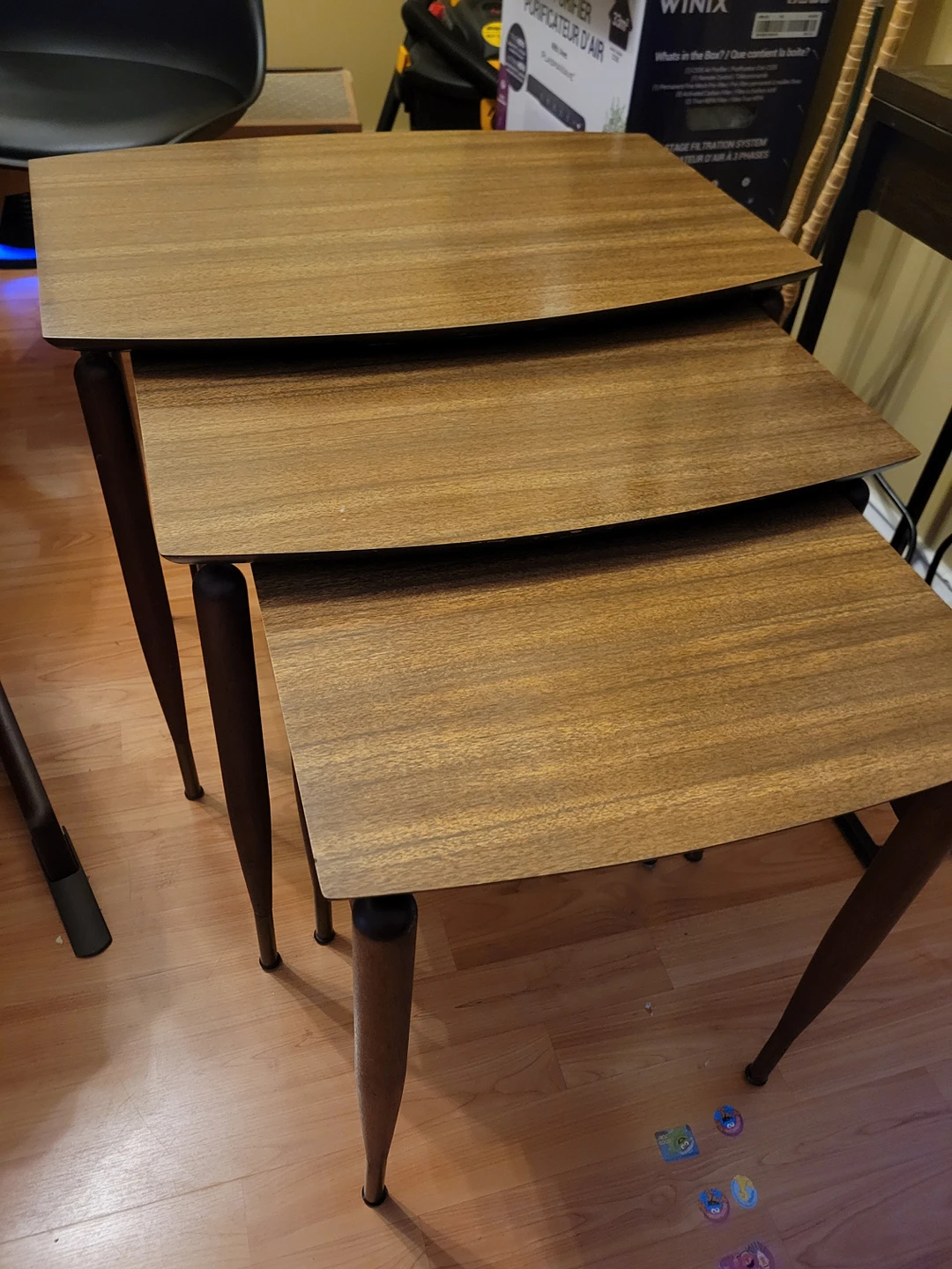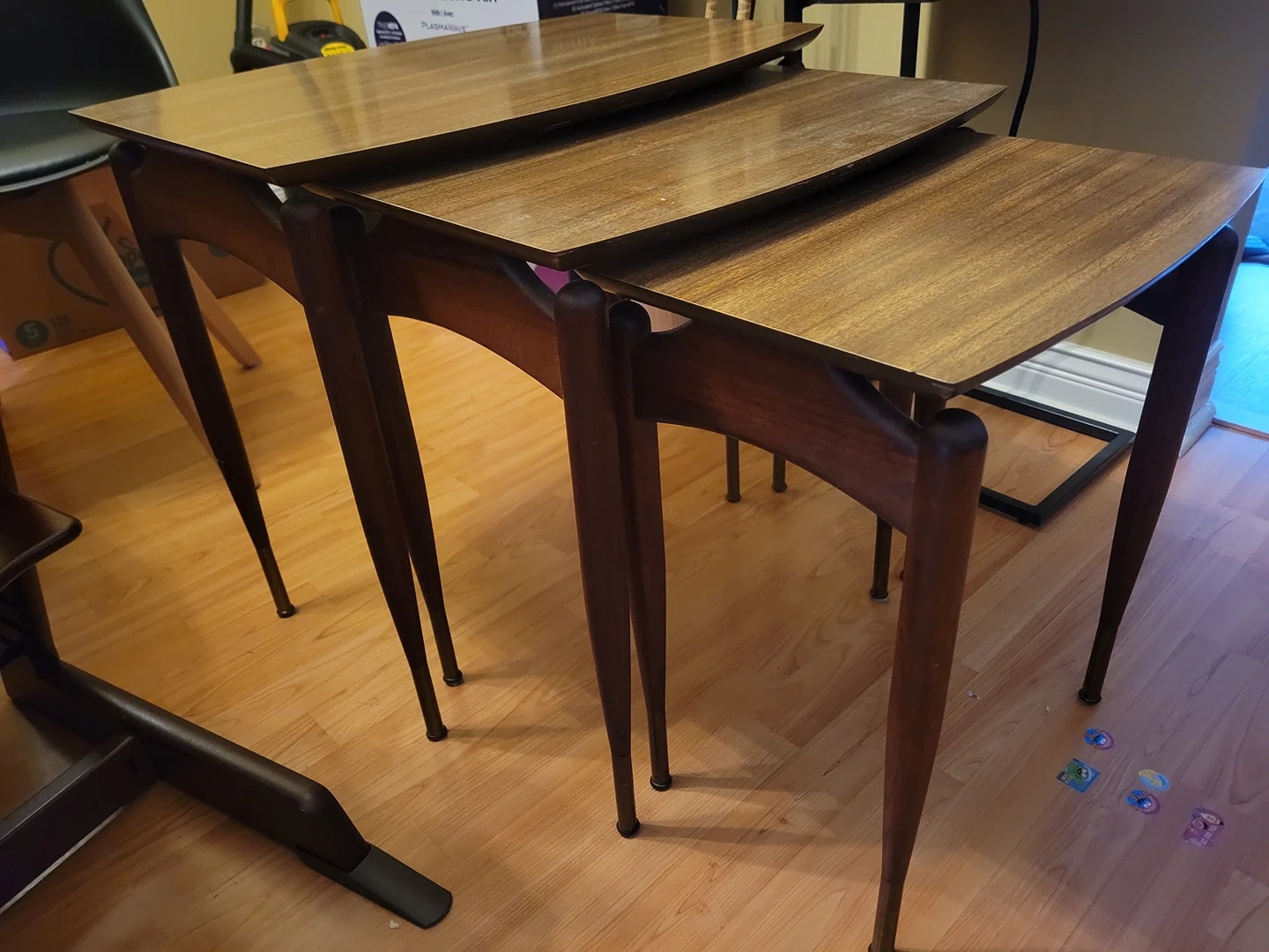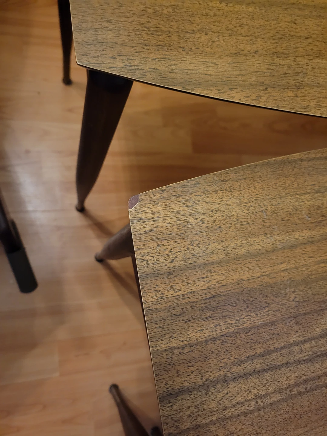 Set of 3 nesting tables. surfaces are in good condition with minor scratches, with exception of minor corner issues on medium and small table.