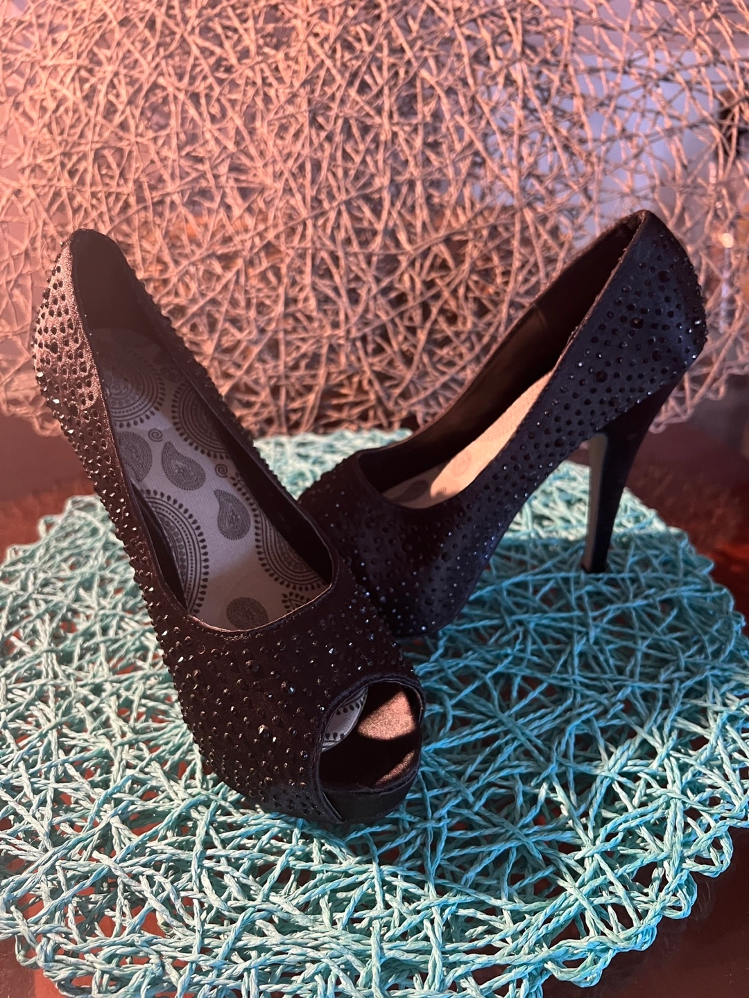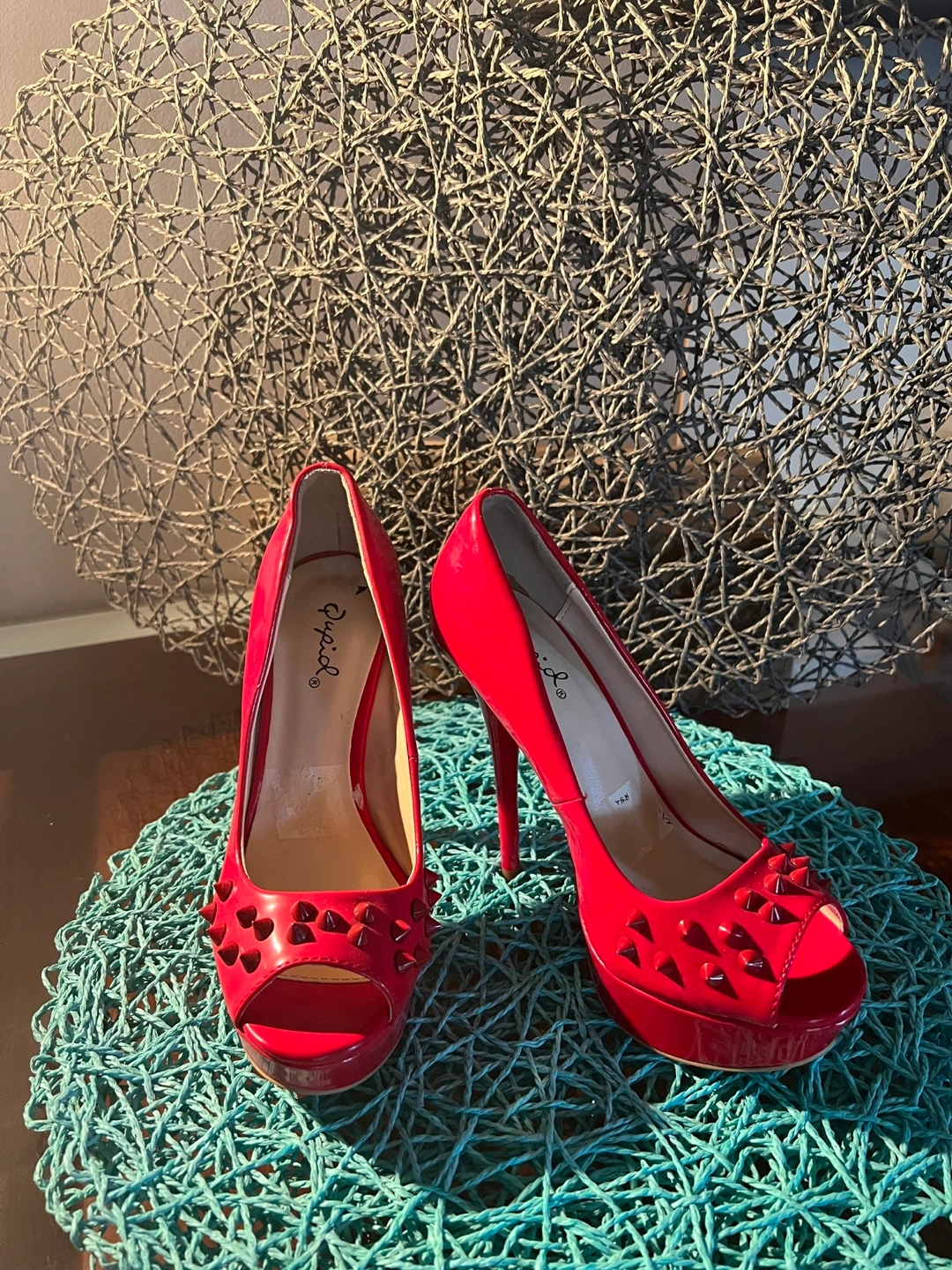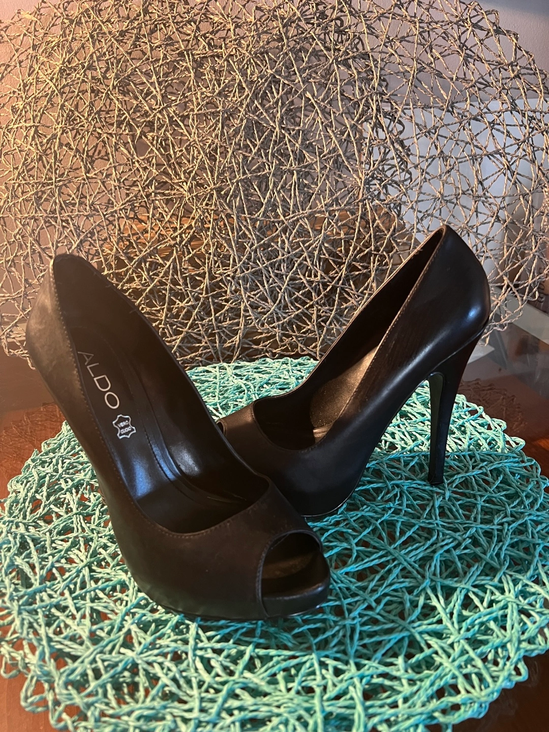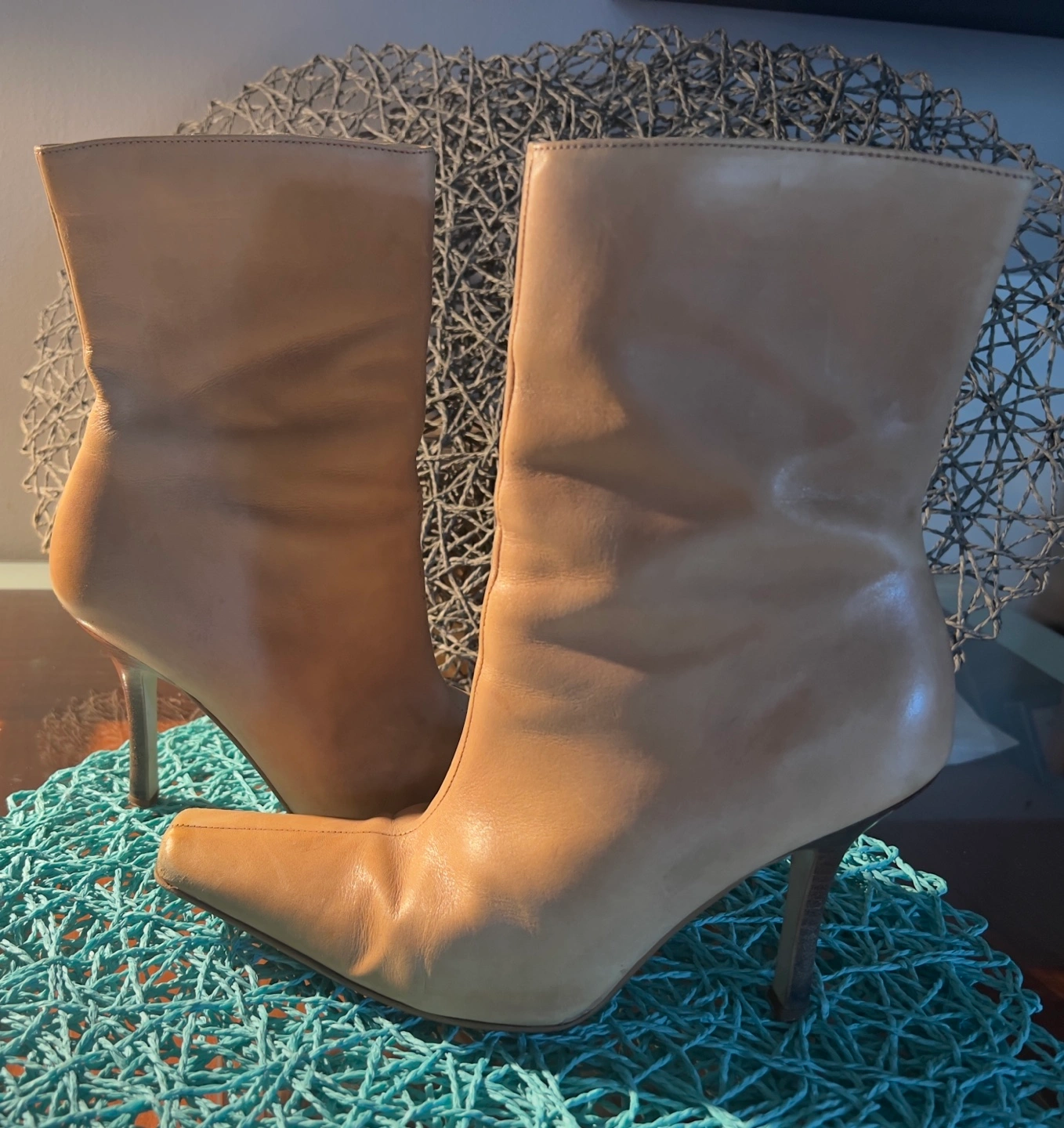 women's high heel shoes in various colours and styles, including a pair of tan boots. All in size 7.