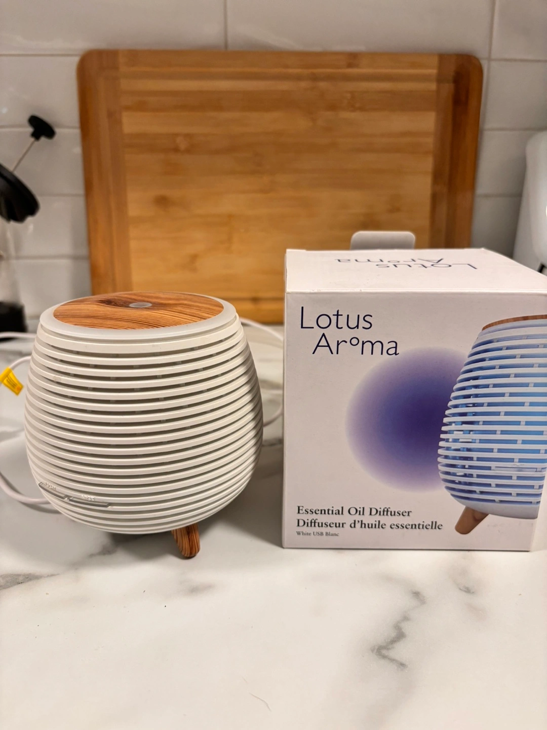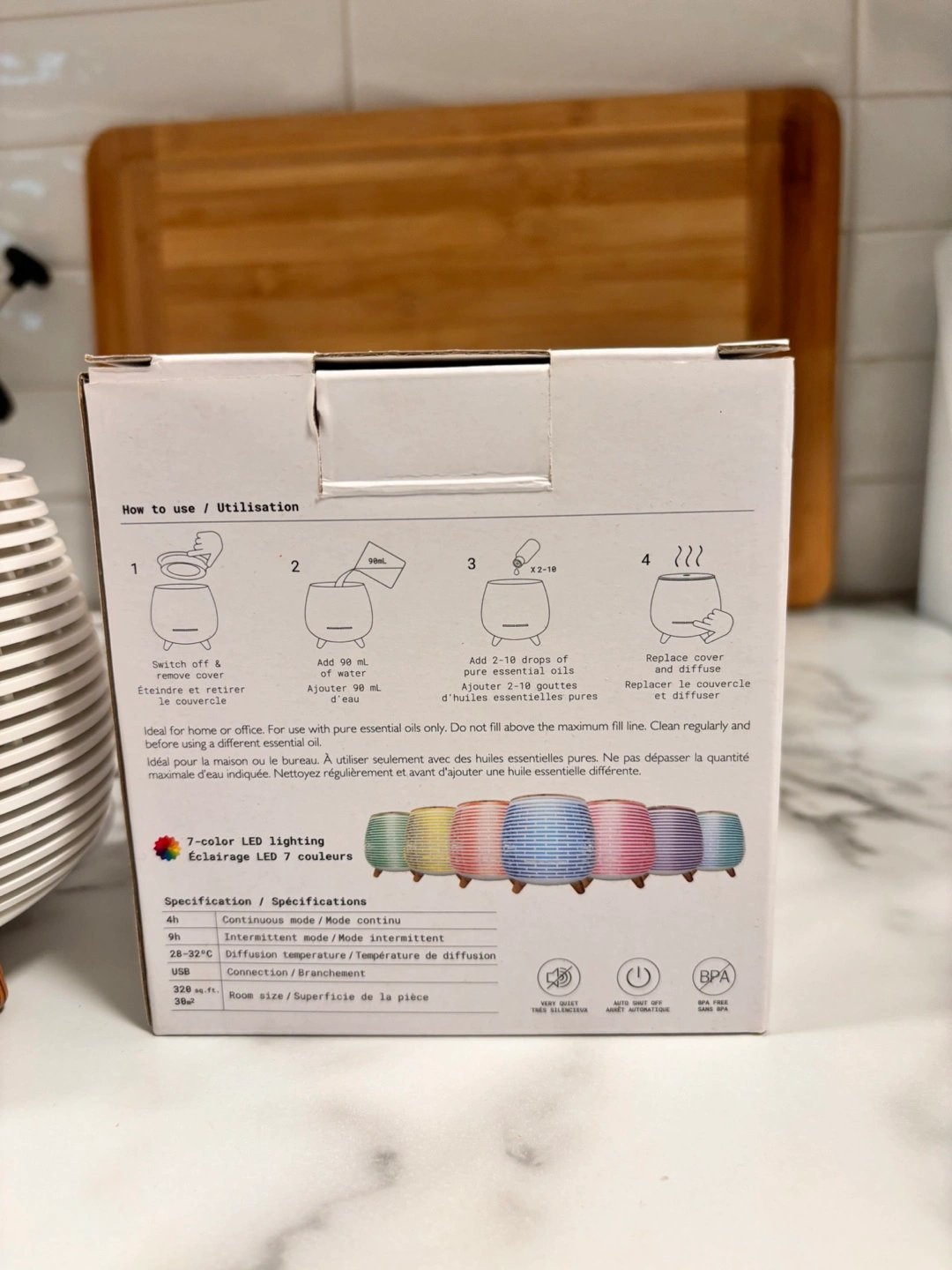 White with wood accents, 7 colour LED lights. Includes a cleaning brush and instruction manual. Inside could use a quick clean but functions like new. I could include 2 oils for free.