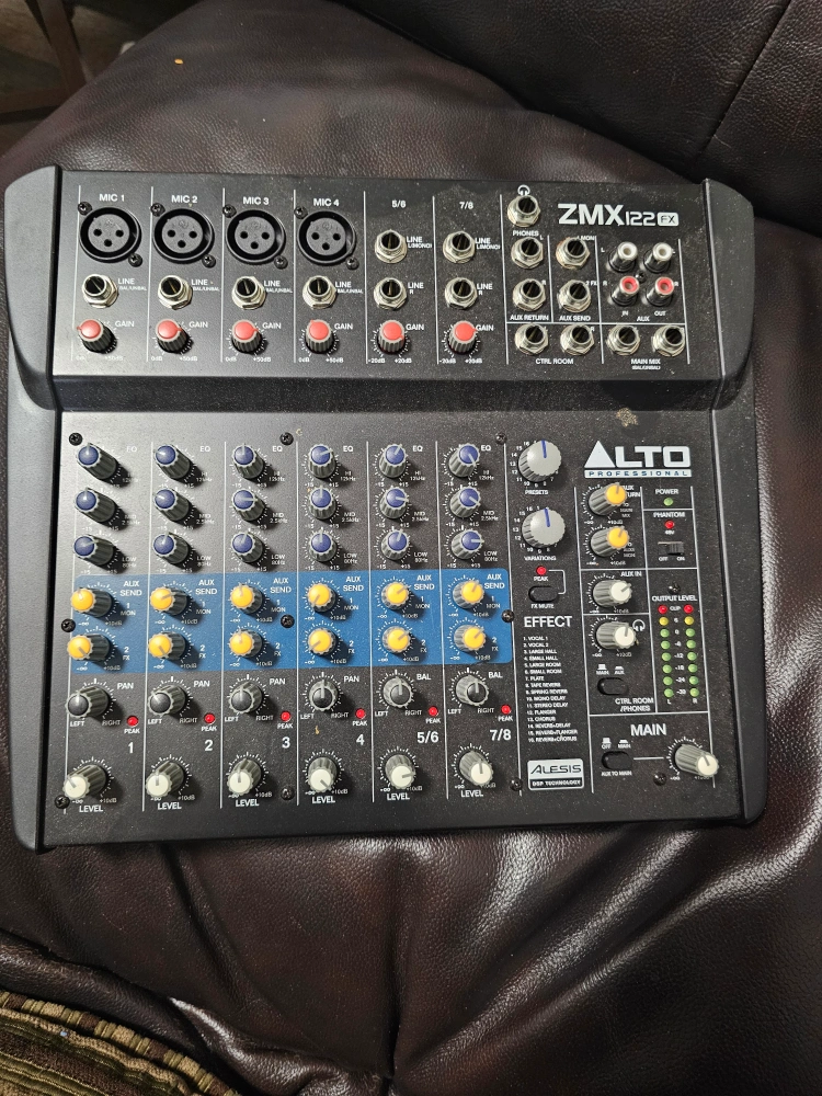 1712-Channel Mixer with built-in effects. Includes 4 microphone inputs, 2 stereo line inputs, and 2 stereo returns. Comes with built in Alesis effects.