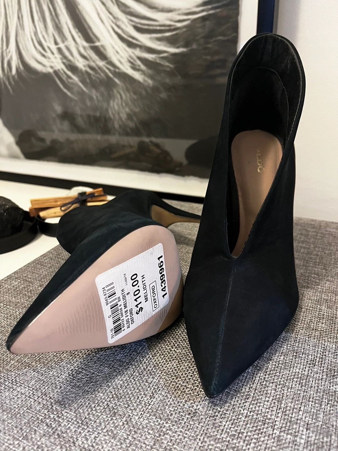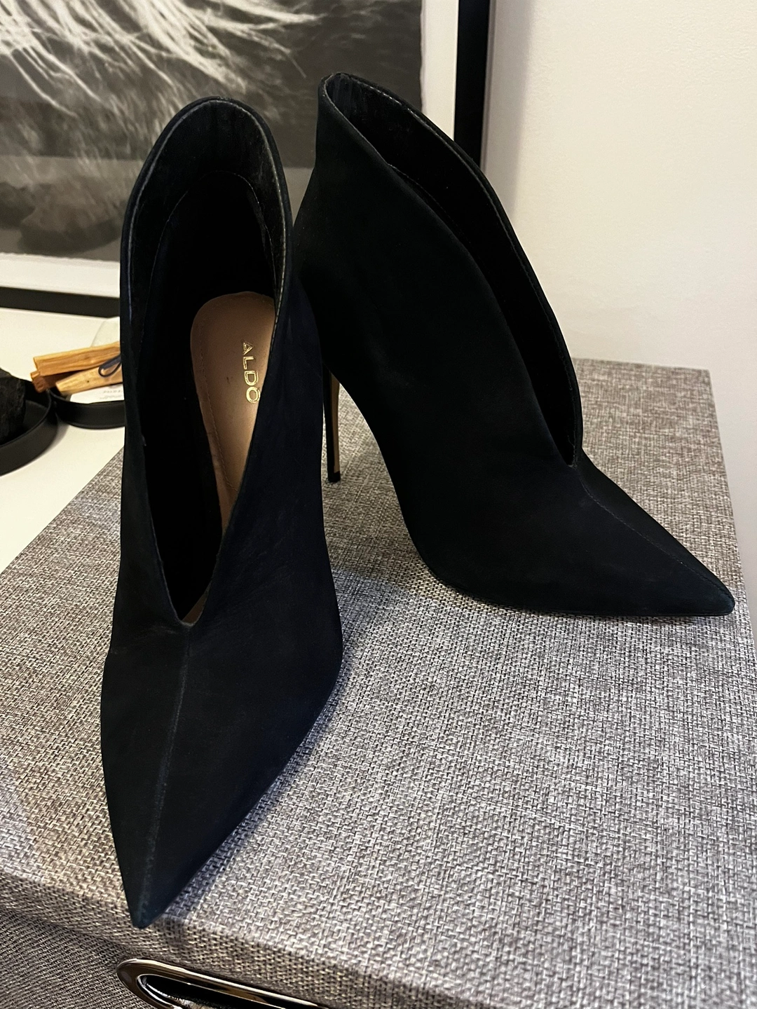 Black Aldo suede booties with a pointed toe and high stiletto heel. Size 8