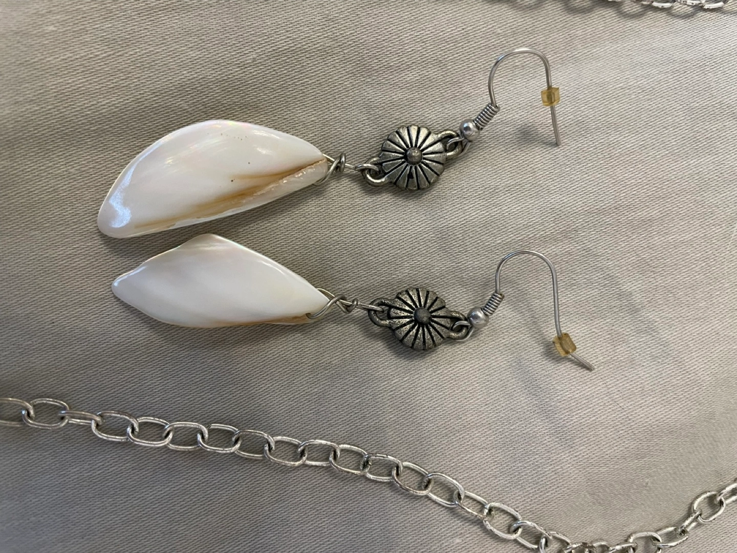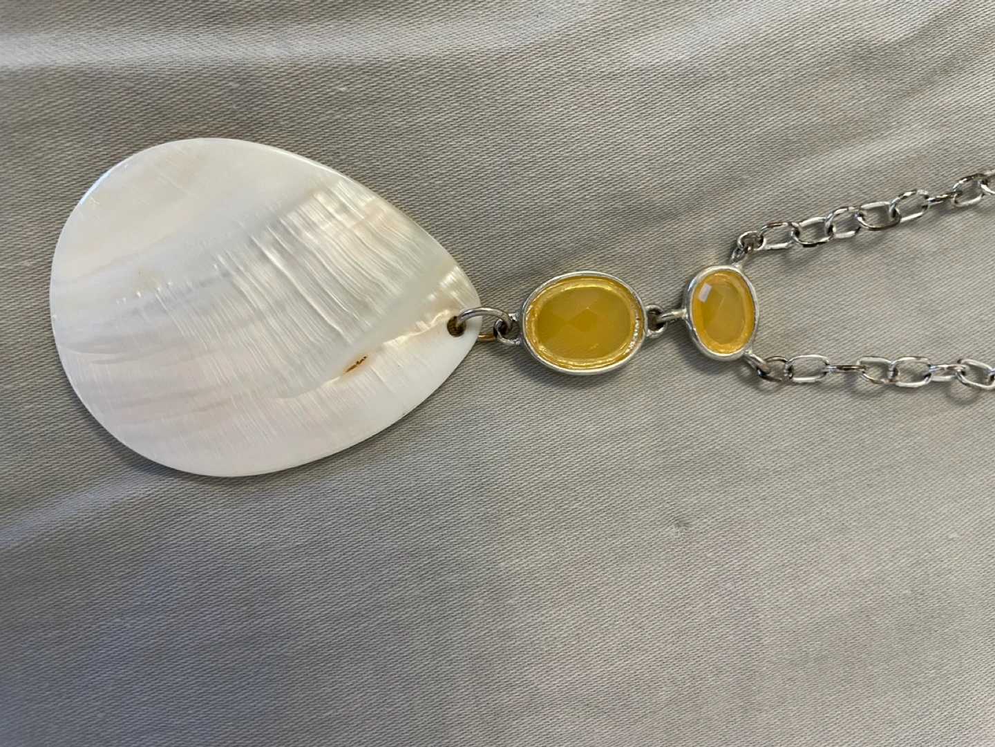A silver chain necklace with a white shell pendant and three yellow stones. Matching earrings with white shell and silver accents.
