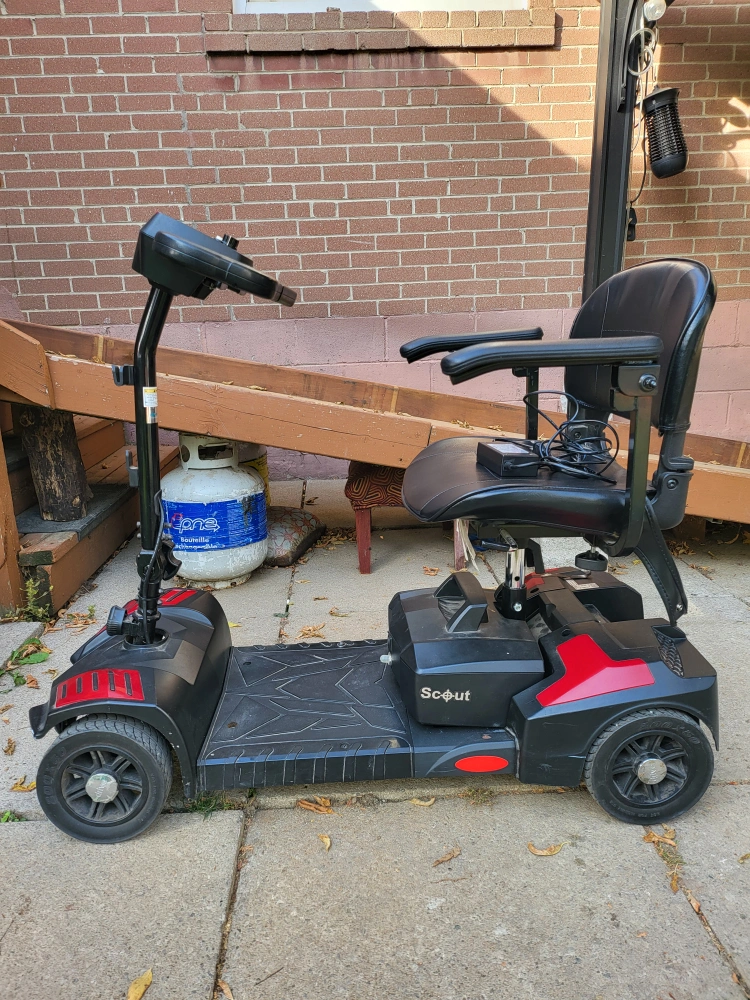 66Black and red mobility scooter with a charger. In good working condition. folds up to put in car. brand new batteries bought 2 weeks ago receipt for batteries in photo under warranty . 401 and islington ave