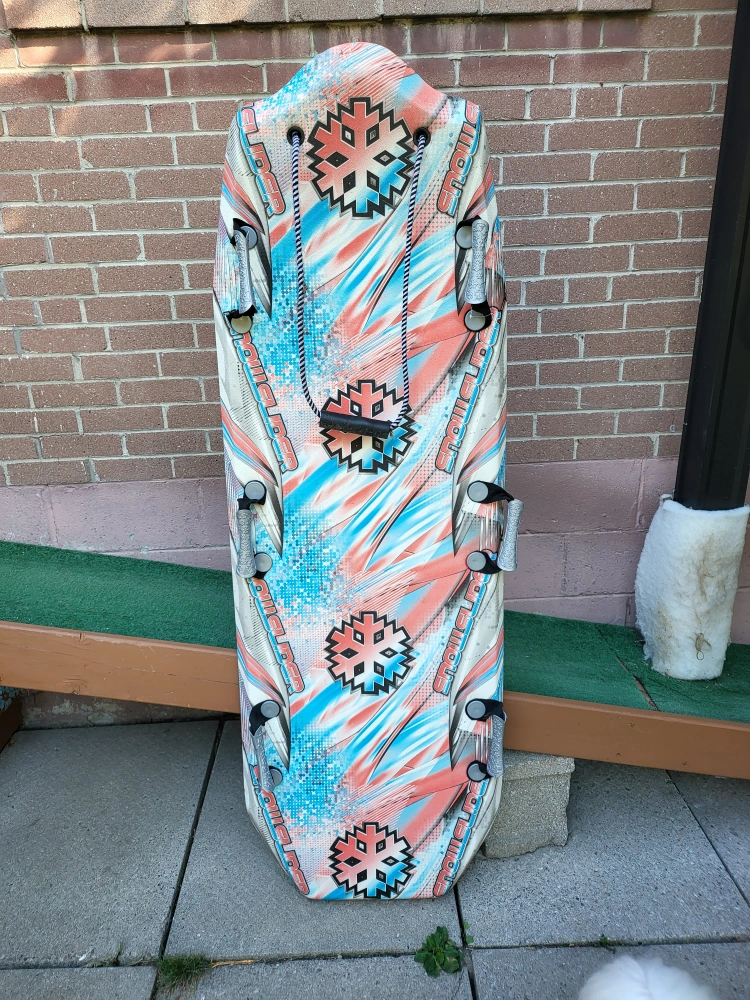 2 Large sled boards with two handles and a pull rope. Has a snowflake pattern. 5ft long