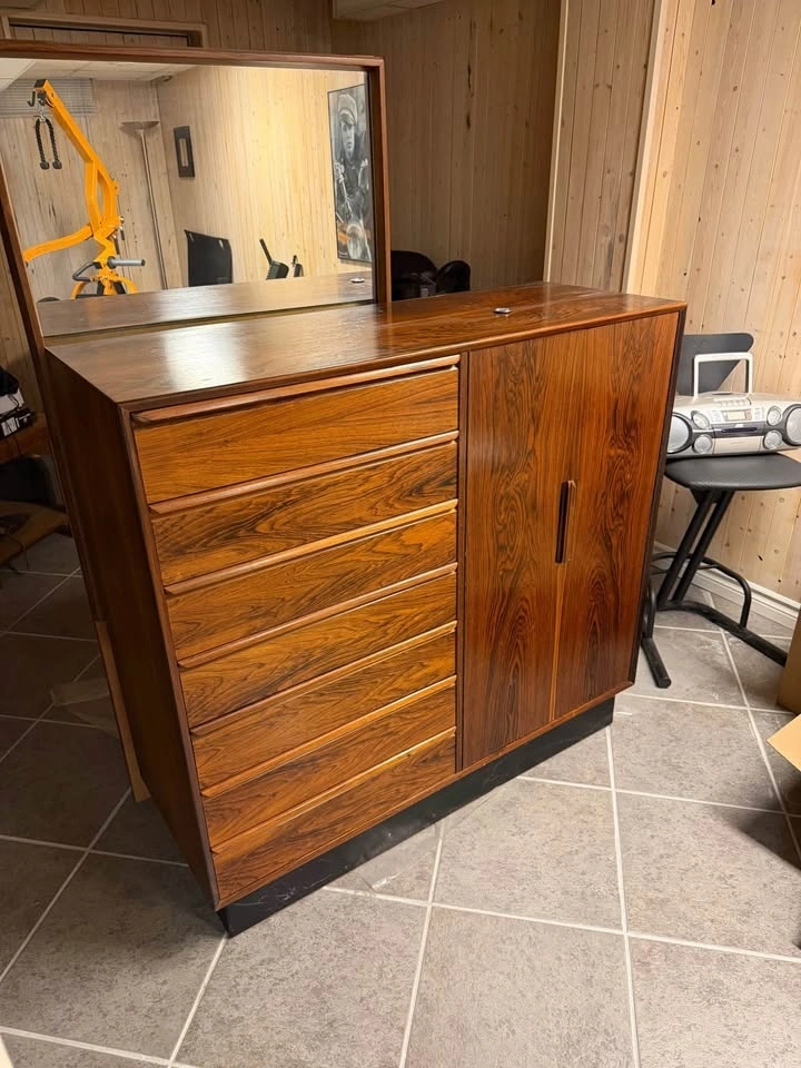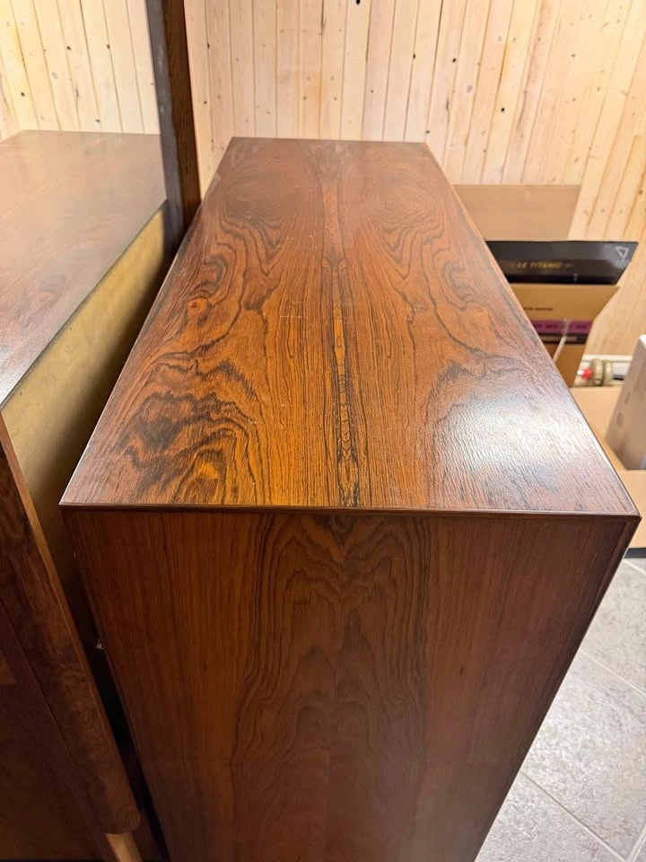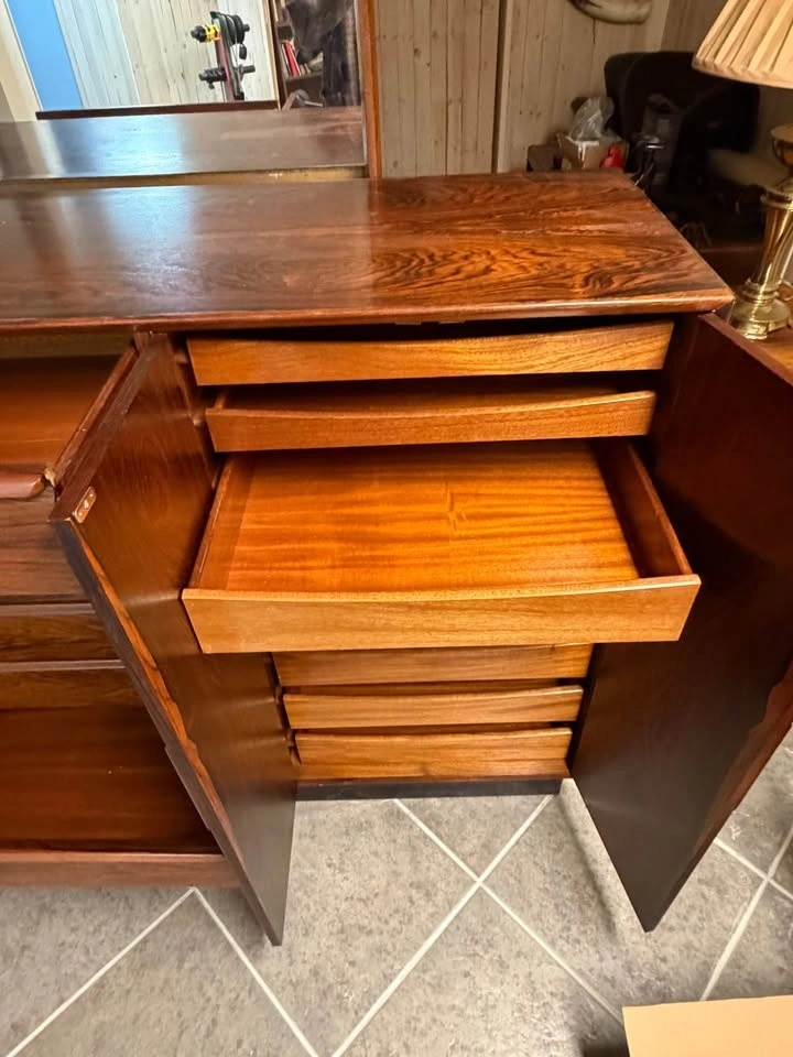 Late 1960s era solid Rosewood bedroom furniture. Scandinavian design, known for using the highest grade rosewood. Brazilian rosewood was banned in 1969, so these are likely from before that time. No visible markings, as they were often faint from manufacturers of that era. This set has been in my family since I was a child.