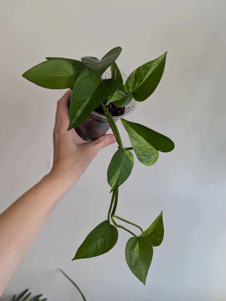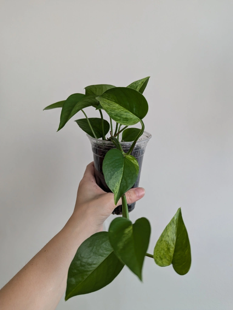 Healthy and well-established pothos plant, growing in a small plastic pot. Perfect for adding a touch of greenery to your home.