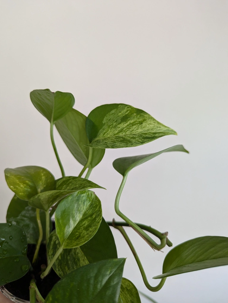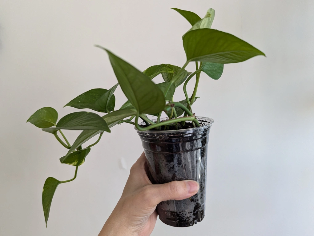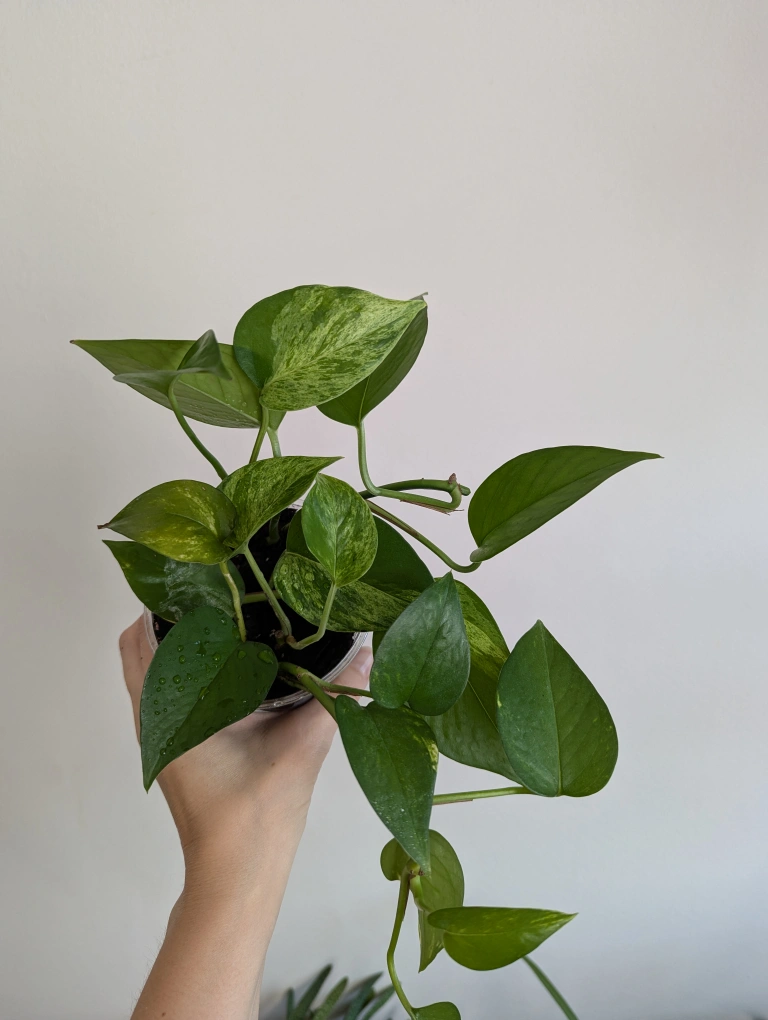 Healthy pothos plant in a small plastic pot. Perfect for adding some greenery to your home.