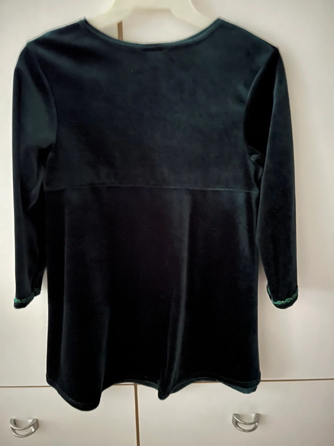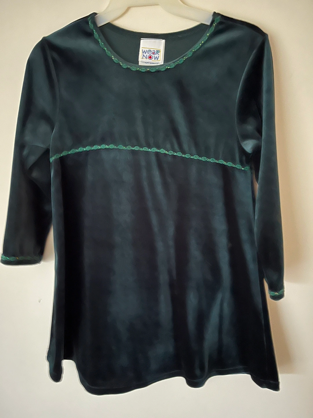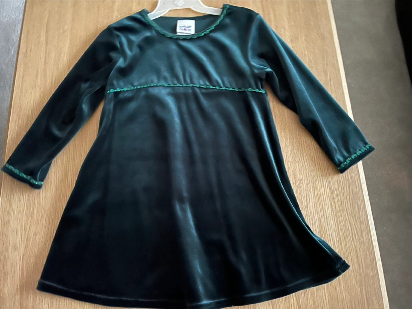 Green velvet dress with 3/4 sleeves. Features subtle gold and green trim details. 100 % polyester. Size 6X. In very good condition. If ad is up, the item is available.