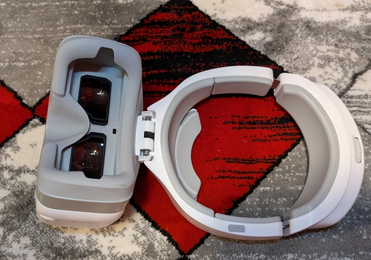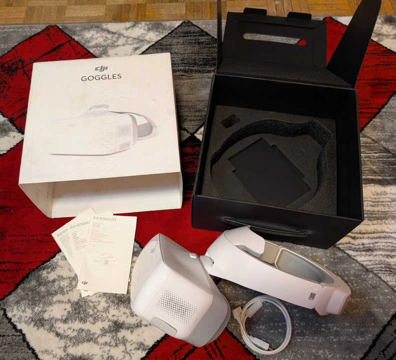 White FPV Goggles with a headband and charging cable. Comes in original box with manuals.