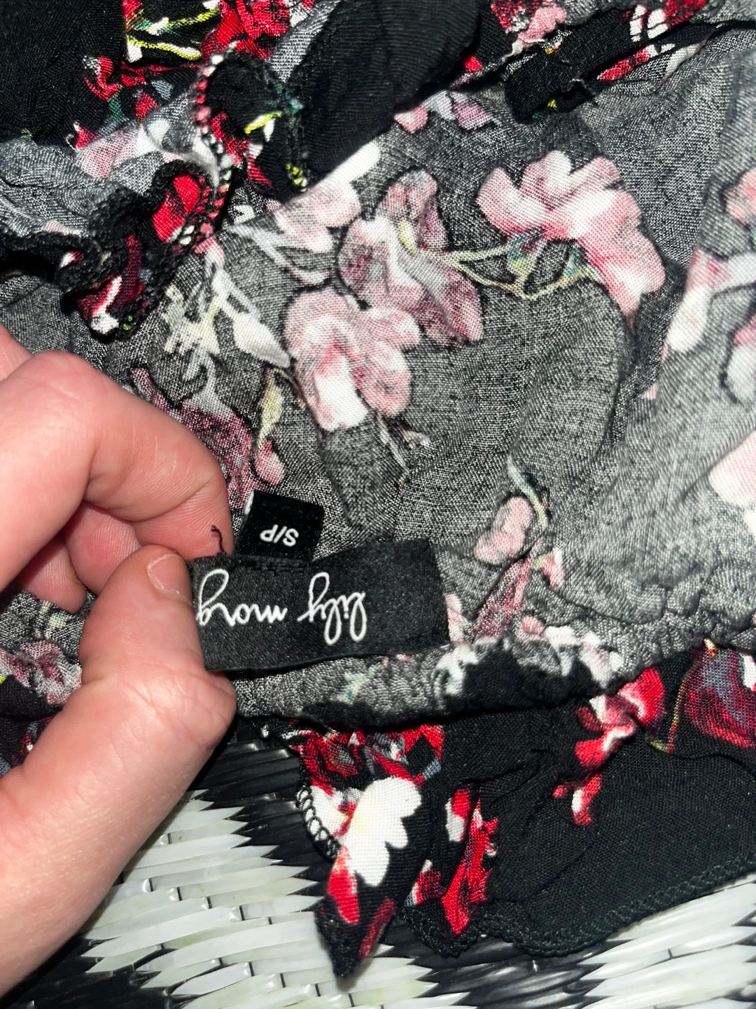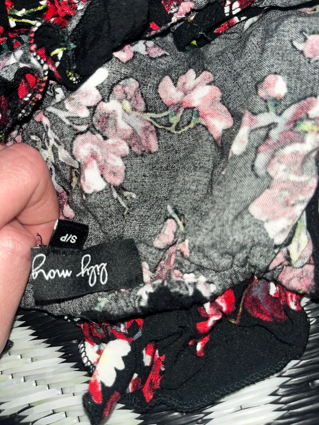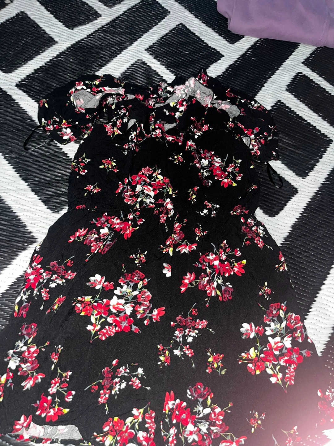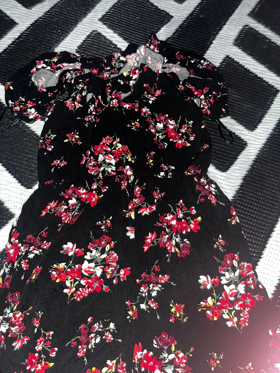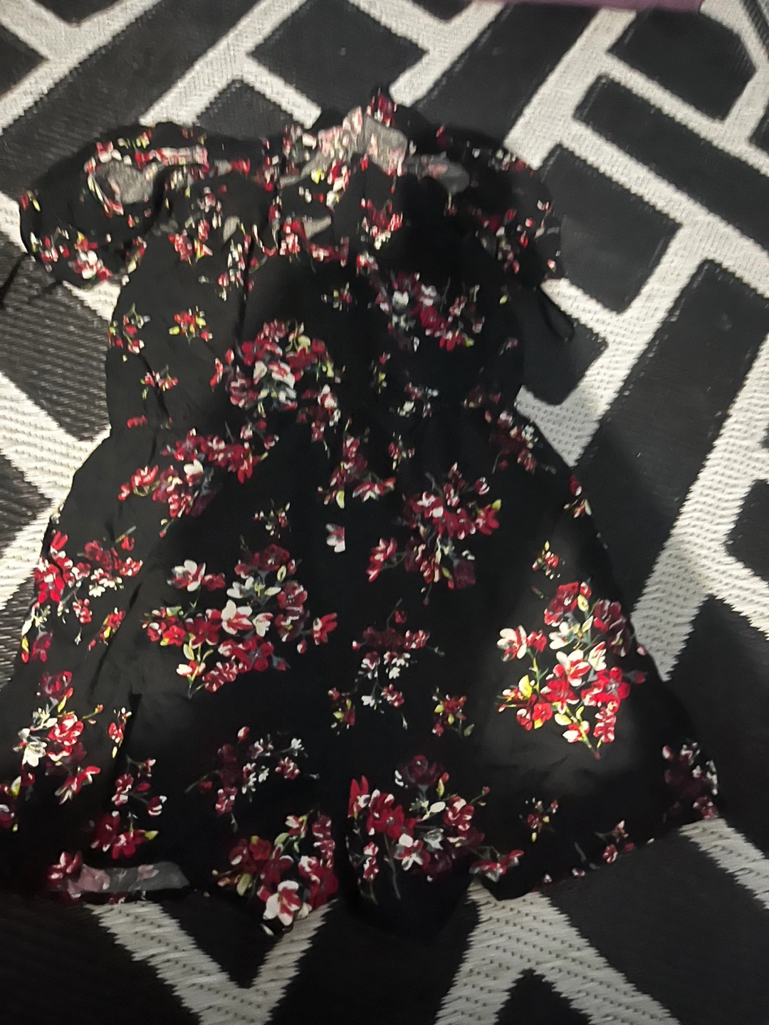 Black and red floral jumpsuit with off-the-shoulder straps. Short sleeves. Worn once want gone asap