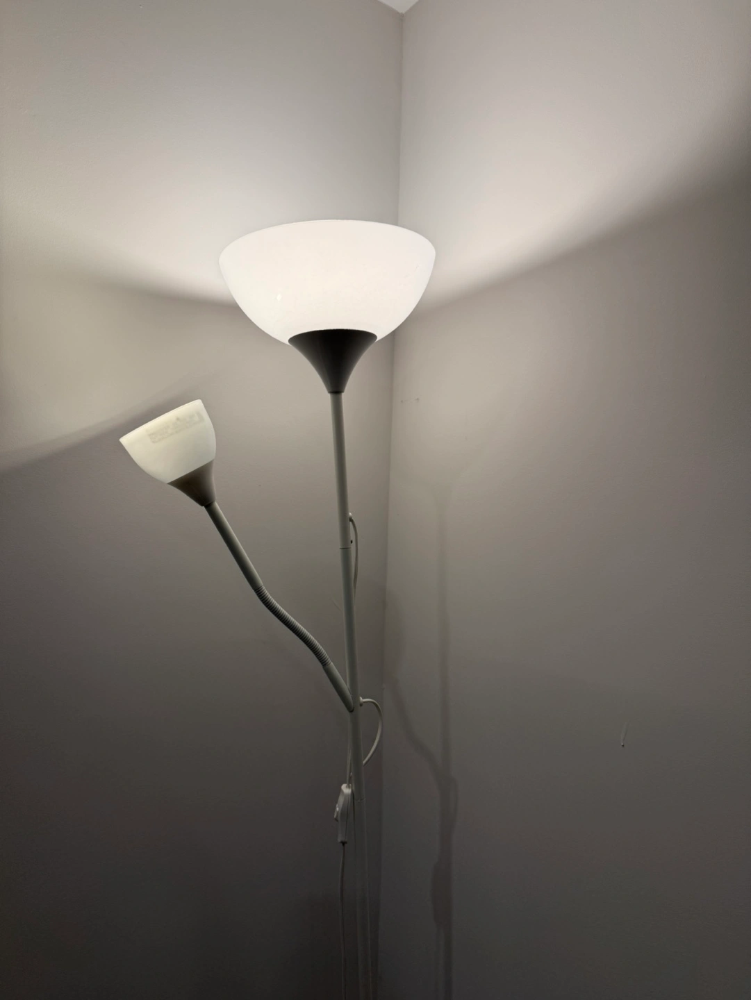 White floor lamp with two lights, one large and one smaller. The smaller light is on a flexible arm. The lamp has a white cord.