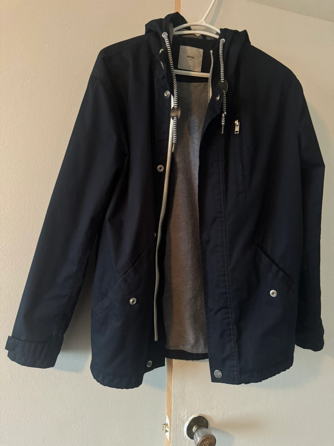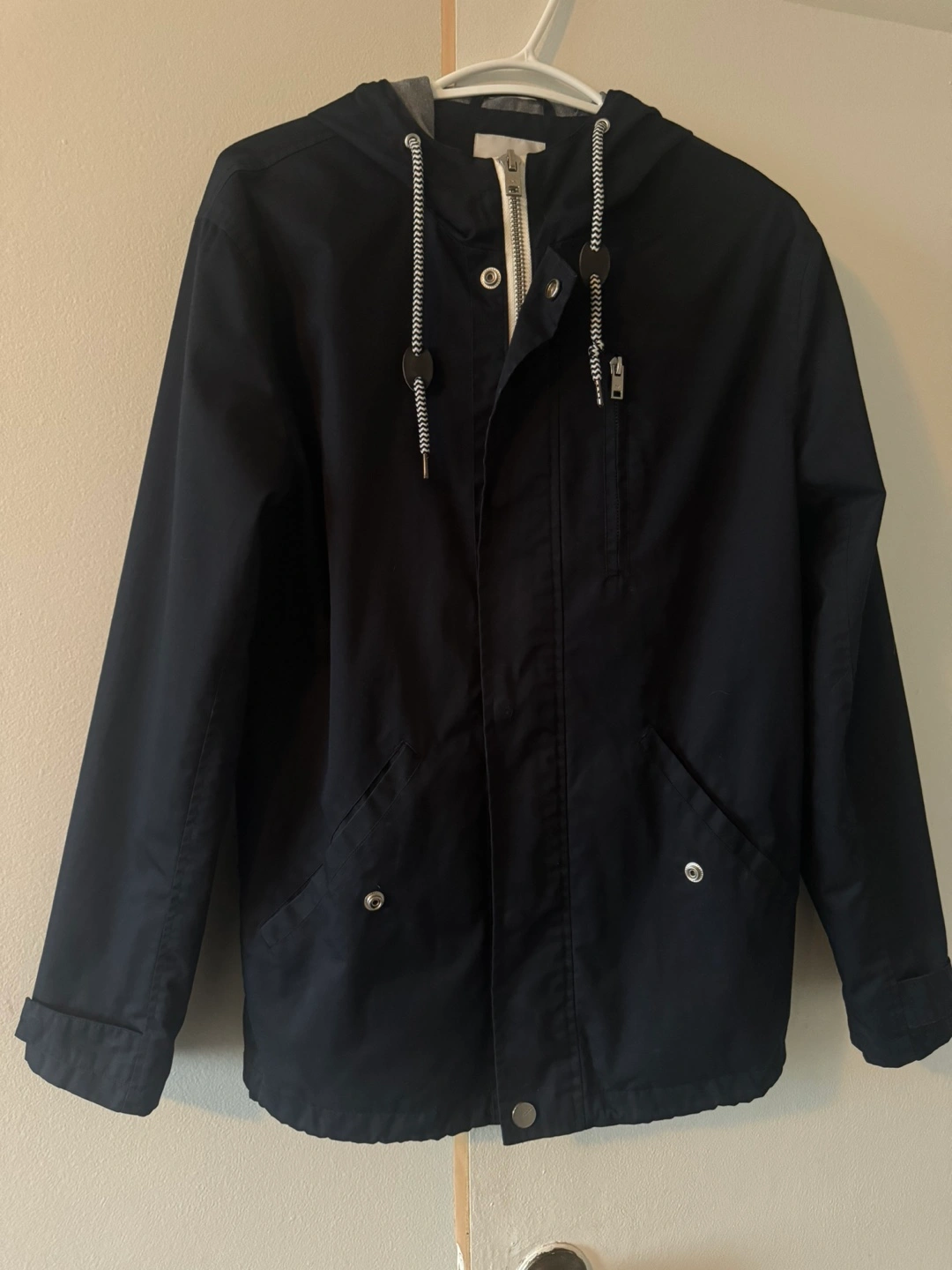 Black hooded jacket with a zipper and button closure. Two front pockets and a zippered pocket on the left sleeve. The inside of the hood has a grey lining. Water resistant Very good condition Size M Pick up in Westend