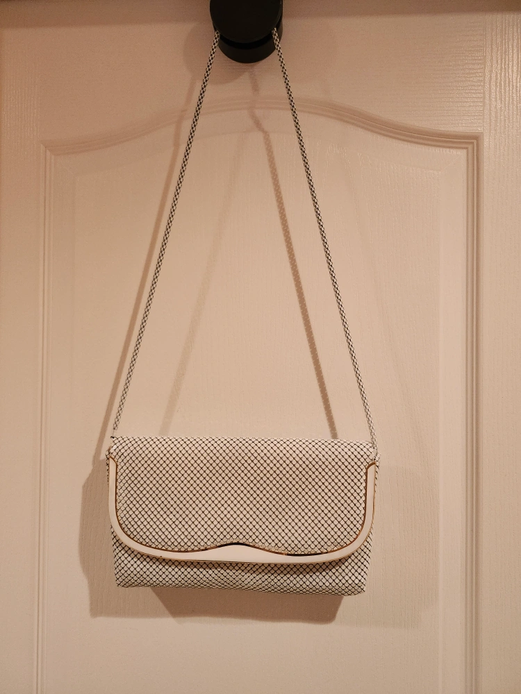 White mesh chain evening bag with gold trim. Has a long chain strap and a clasp closure.