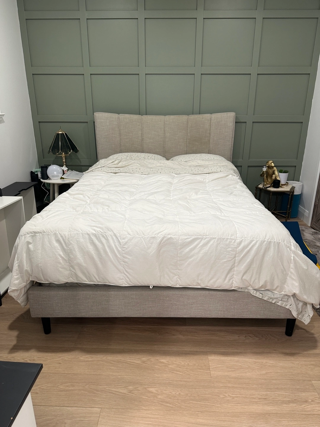 Grey upholstered bed frame, queen-sized. Good condition. Already dismantled and ready for transport!
