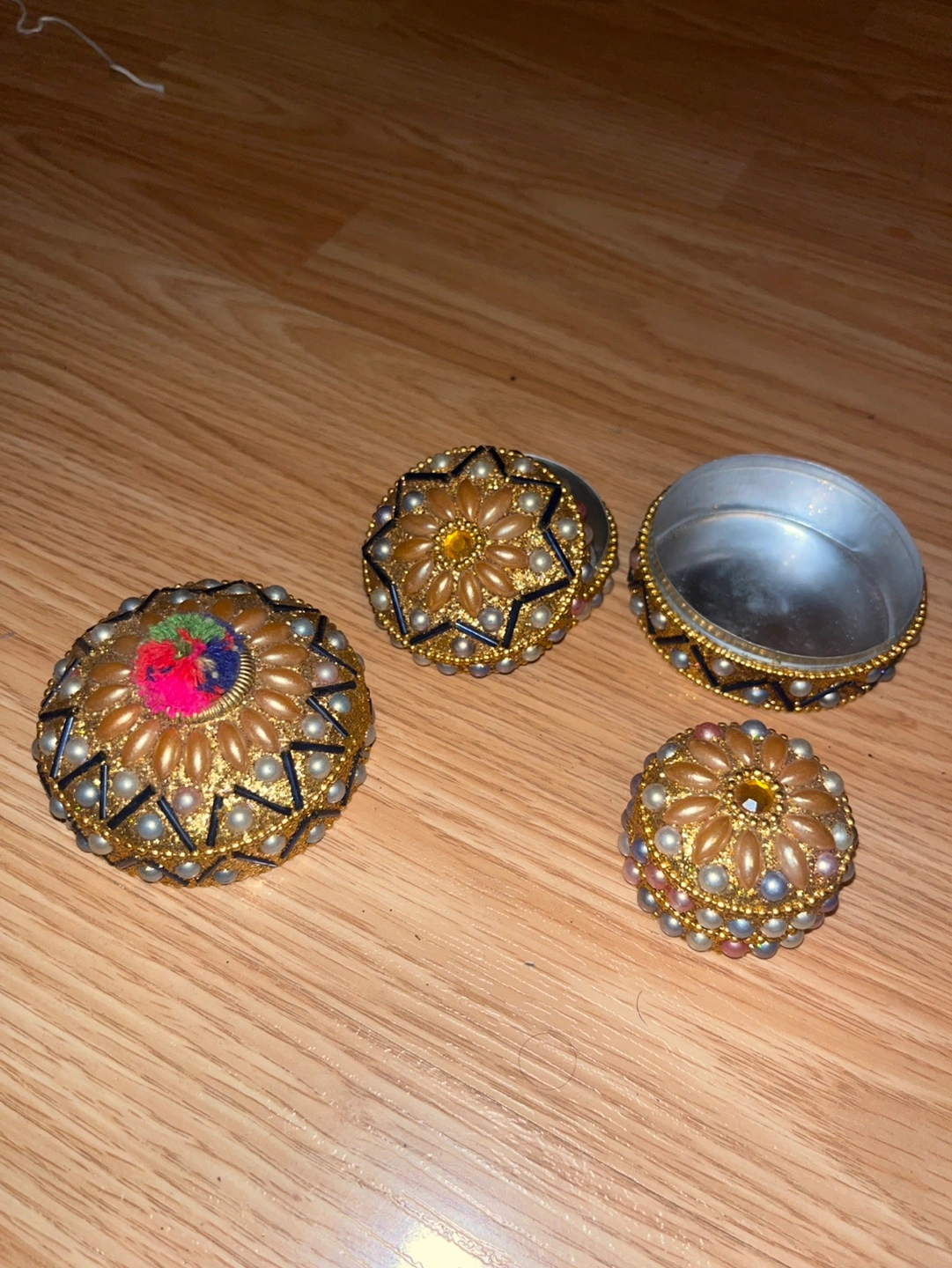 Small, round trinket box with a gold finish and intricate floral design. The box is adorned with pearls and has a removable lid. It has a silver interior. Souvenir from Morocco. Pick up only.