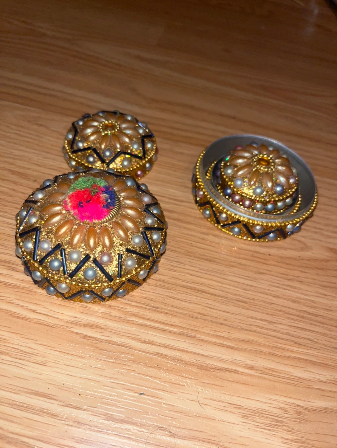 Small, round trinket box with a gold finish and intricate floral design. The box is adorned with pearls and has a removable lid. It has a silver interior. Souvenir from Morocco. Pick up only.