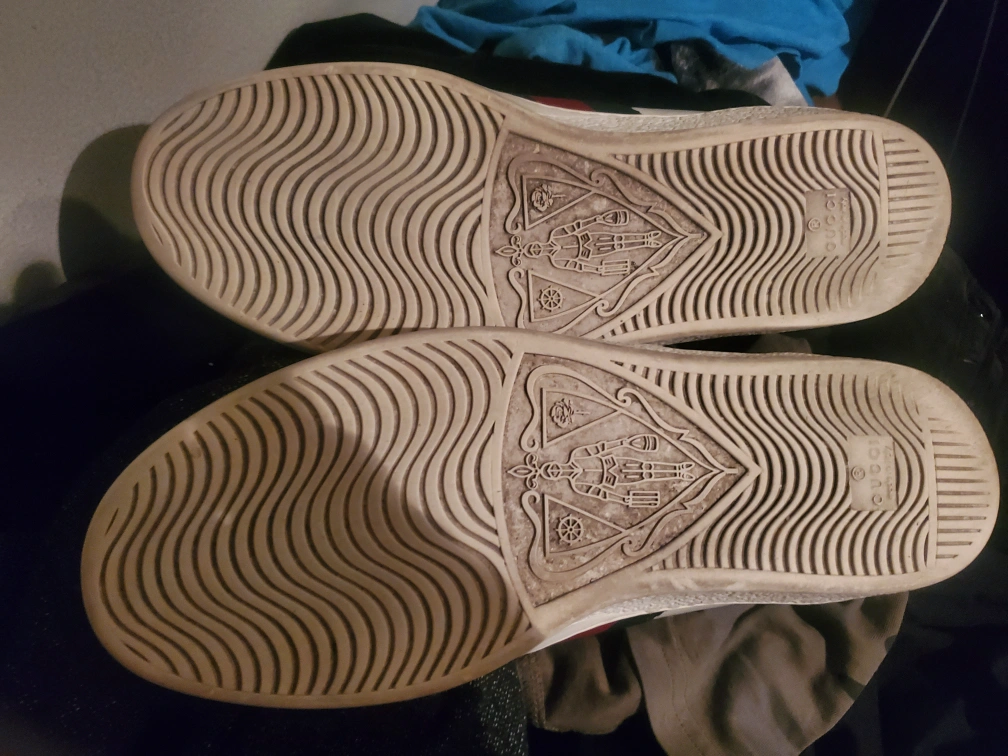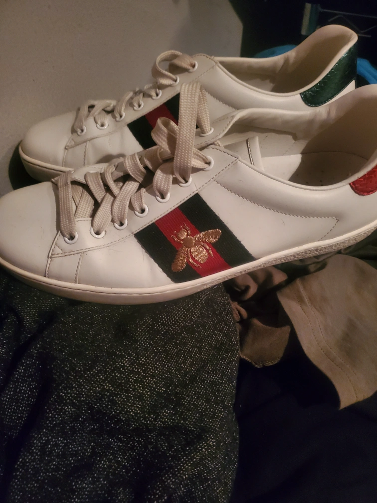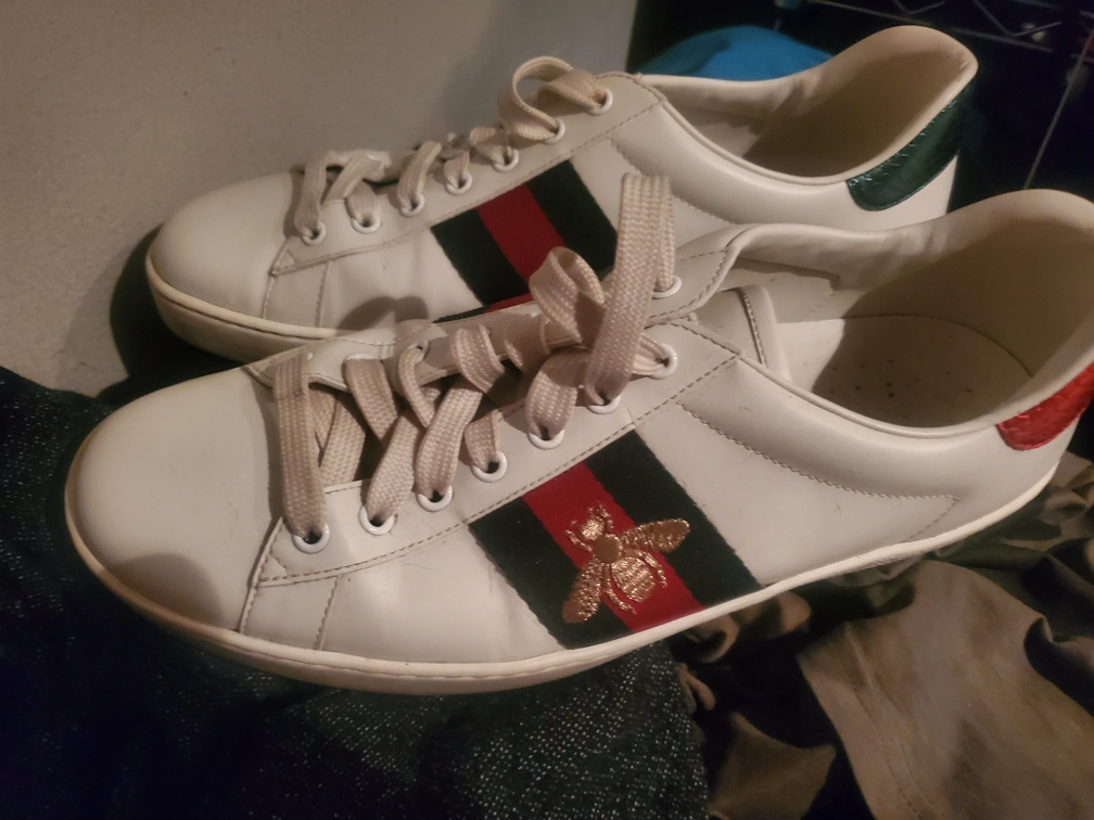 67White leather sneakers with a bee logo. Green and red stripe detail.