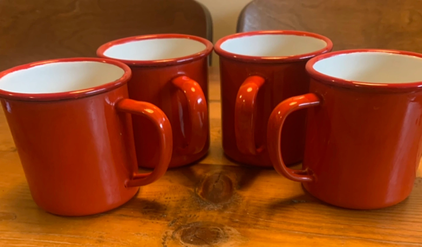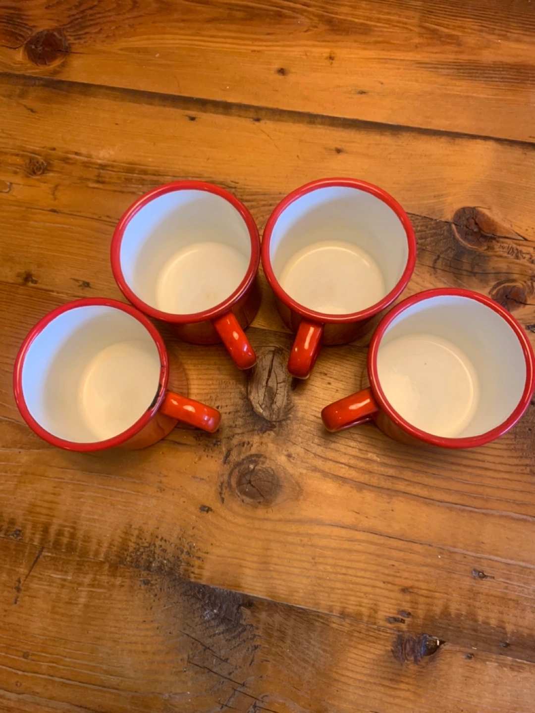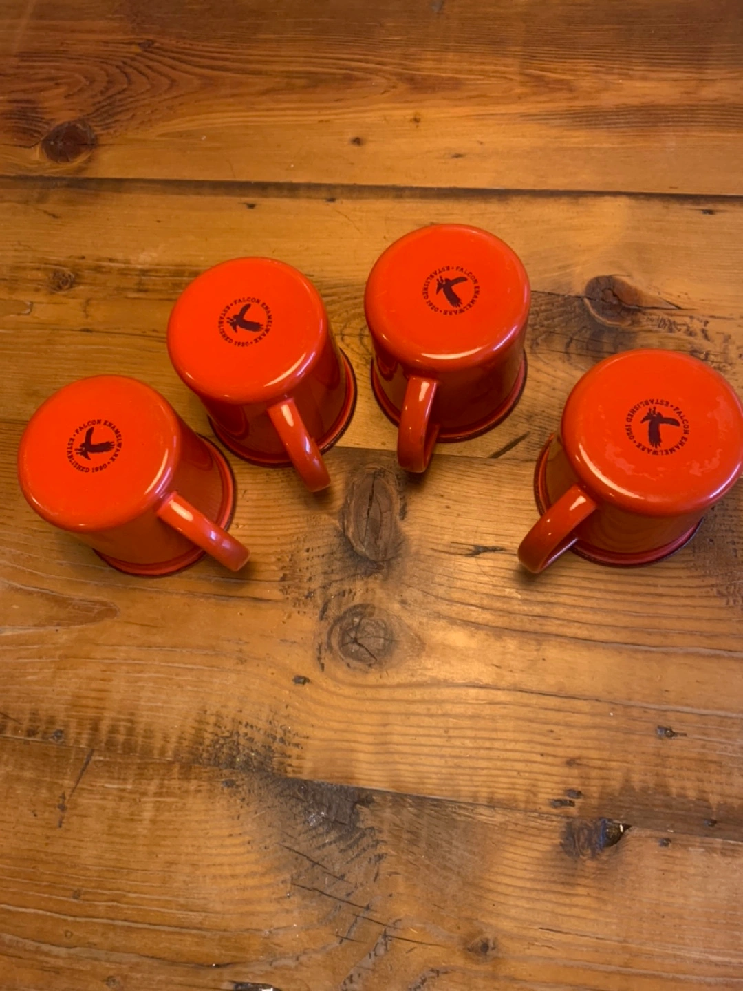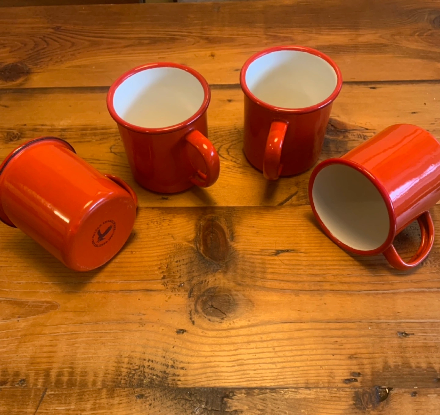 The classic Falcon mug design, but manufactured from heavyweight steel and thicker enamel for extra durability. https://us.falconenamelware.com/collections/drinking/products/enamel-mug?variant=43423872090346 Height: 8cm Rim Diameter: 8cm Base Diameter: 8cm Capacity: 350ml Set of 4 red enamel mugs with white interiors and black rims. Handles are also red. One mug has some damage on the rim- adds to the rustic charm!
